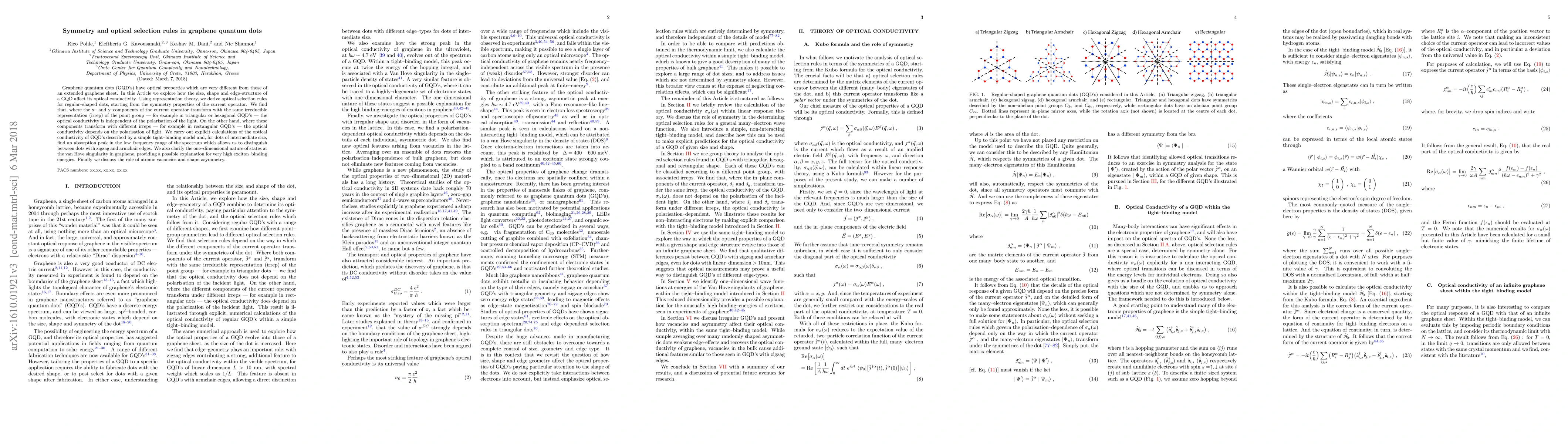 Graphene quantum dots (GQD's) have optical properties which are very different from those of an extended graphene sheet. In this Article we explore how the size, shape and edge--structure of a GQD affect its optical conductivity. Using representation theory, we derive optical selection rules for regular-shaped dots, starting from the symmetry properties of the current operator. We find that, where the x- and y-components of the current operator transform with the same irreducible representation (irrep) of the point group - for example in triangular or hexagonal GQD's - the optical conductivity is independent of the polarisation of the light. On the other hand, where these components transform with different irreps - for example in rectangular GQD's - the optical conductivity depends on the polarisation of light. We find that GQD's with non-commuting point-group operations - for example dots of rectangular shape - can be distinguished from GQD's with commuting point-group operations - for example dots of triangular or hexagonal shape - by using polarized light. We carry out explicit calculations of the optical conductivity of GQD's described by a simple tight--binding model and, for dots of intermediate size, \textcolor{blue}{($10 \lesssim L \lesssim 50\ \text{nm}$)} find an absorption peak in the low--frequency range of the spectrum which allows us to distinguish between dots with zigzag and armchair edges. We also clarify the one-dimensional nature of states at the van Hove singularity in graphene, providing a possible explanation for very high exciton-binding energies. Finally we discuss the role of atomic vacancies and shape asymmetry.