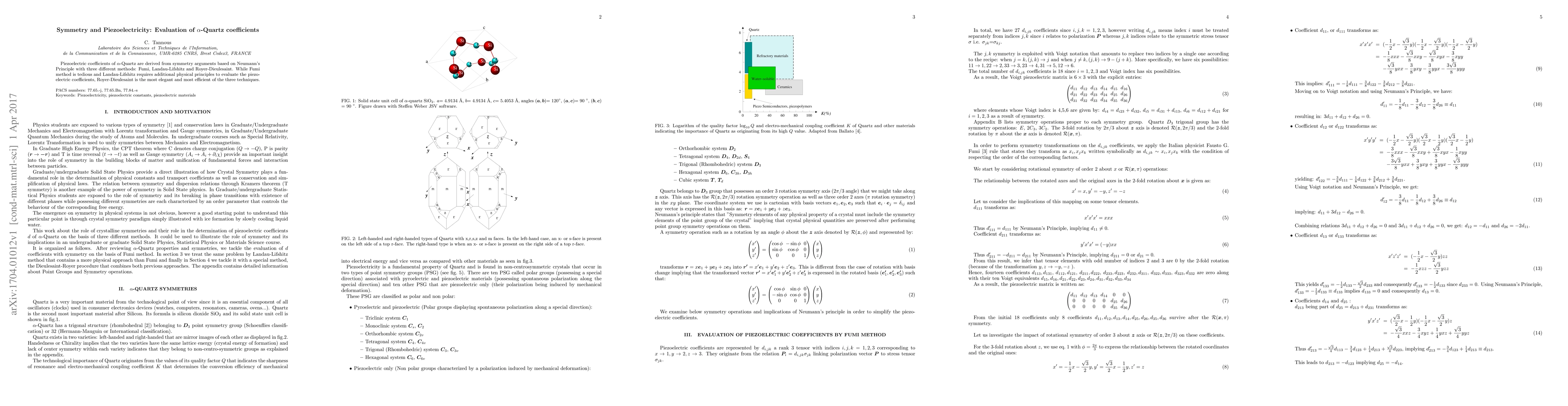 Researchers used symmetry arguments to calculate piezoelectric coefficients of $eta$-Quartz using three methods: Fumi, Landau-Lifshitz, and Royer-Dieulesaint, with the latter being the most efficient and elegant.