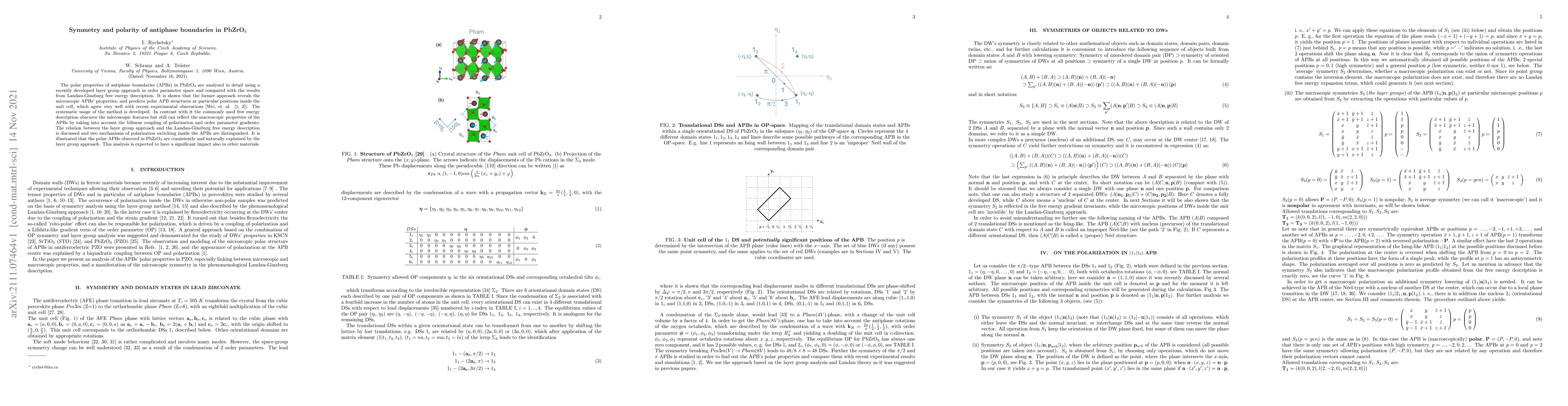 The polar properties of antiphase boundaries (APBs) in PbZrO$_3$ are analyzed in detail using a recently developed layer group approach in order parameter space and compared with the results from Landau-Ginzburg free energy description. It is shown that the former approach reveals the microscopic APBs' properties, and predicts polar APB structures at particular positions inside the unit cell, which agree very well with recent experimental obsevations [Wei, et.~al. \cite{Wei2014,Wei2015}]. The systematic usage of the method is developed. In contrast with it the commonly used free energy description obscures the microscopic features but still can reflect the macroscopic properties of the APBs by taking into account the bilinear coupling of polarization and order parameter gradients. The relation between the layer group approach and the Landau-Ginzburg free energy description is discussed and two mechanisms of polarization switching inside the APBs are distinguished. It is illustrated that the polar APBs observed in PbZrO$_3$ are consistently and naturally explained by the layer group approach. This analysis is expected to have a significant impact also in other materials.