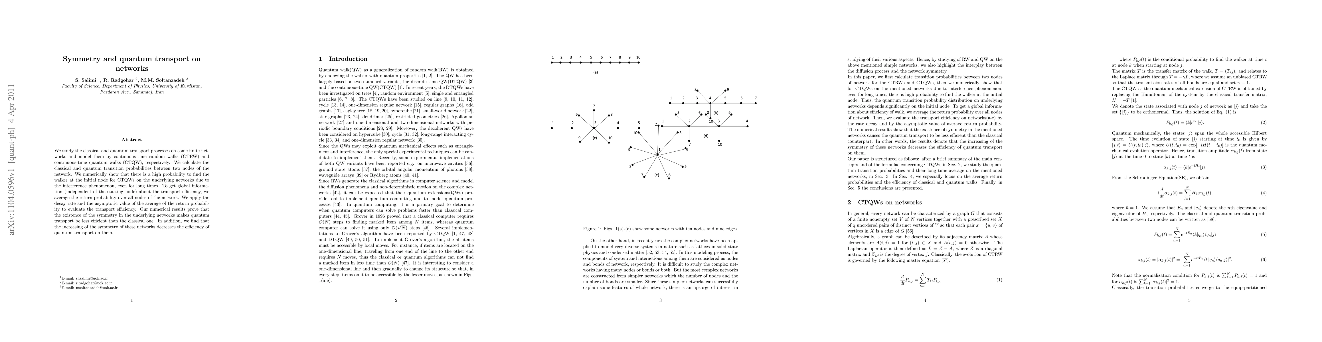 We study the classical and quantum transport processes on some finite networks and model them by continuous-time random walks (CTRW) and continuous-time quantum walks (CTQW), respectively. We calculate the classical and quantum transition probabilities between two nodes of the network. We numerically show that there is a high probability to find the walker at the initial node for CTQWs on the underlying networks due to the interference phenomenon, even for long times. To get global information (independent of the starting node) about the transport efficiency, we average the return probability over all nodes of the network. We apply the decay rate and the asymptotic value of the average of the return probability to evaluate the transport efficiency. Our numerical results prove that the existence of the symmetry in the underlying networks makes quantum transport less efficient than the classical one. In addition, we find that the increasing of the symmetry of these networks decreases the efficiency of quantum transport on them.