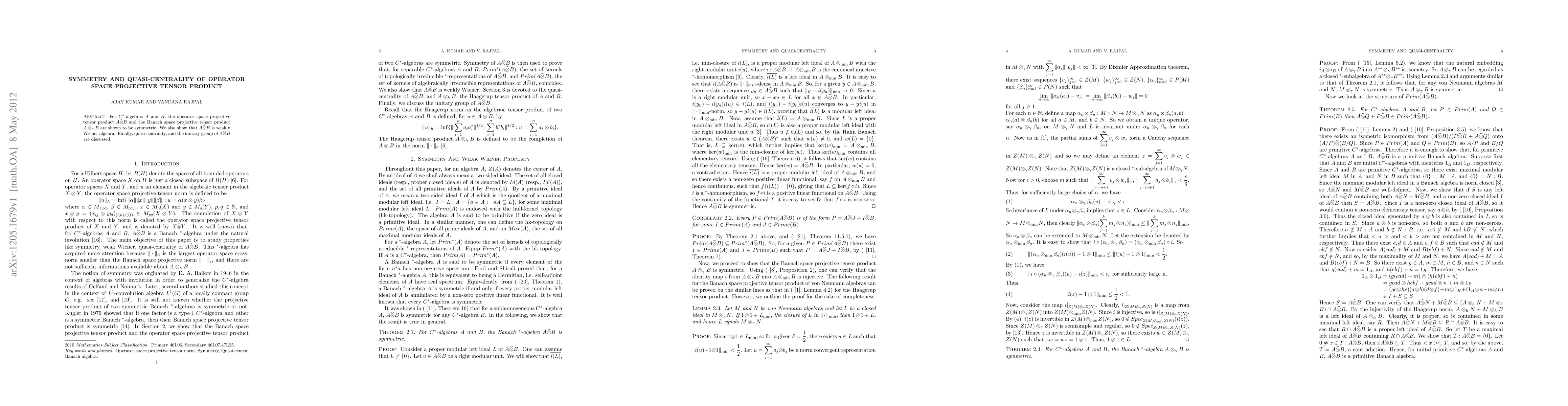 The paper demonstrates symmetry properties of the operator space projective tensor product $A\hat{\otimes}B$ for $C^{*}$-algebras $A$ and $B$, and shows it to be a weakly Wiener algebra. Additionally, it explores quasi-centrality and the unitary group of this tensor product.