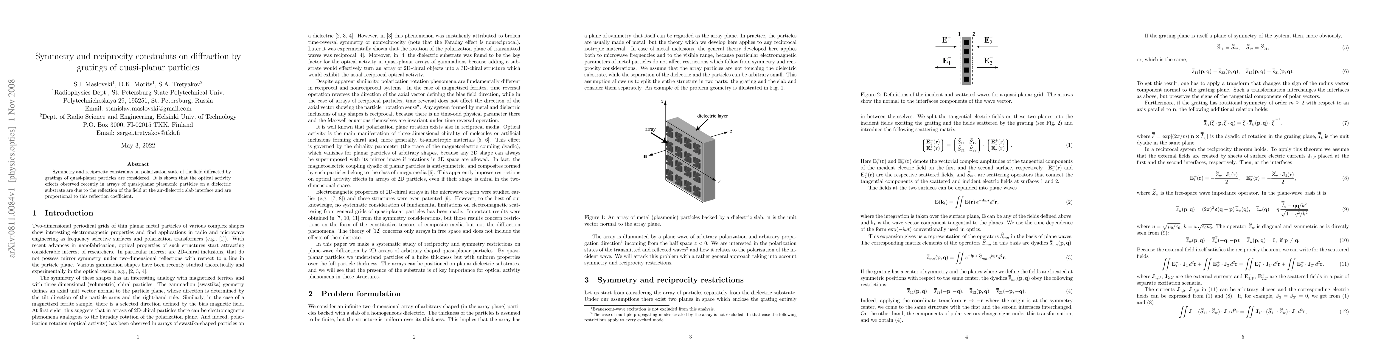 Symmetry and reciprocity constraints on polarization state of the field diffracted by gratings of quasi-planar particles are considered. It is shown that the optical activity effects observed recently in arrays of quasi-planar plasmonic particles on a dielectric substrate are due to the reflection of the field at the air-dielectric slab interface and are proportional to this reflection coefficient.