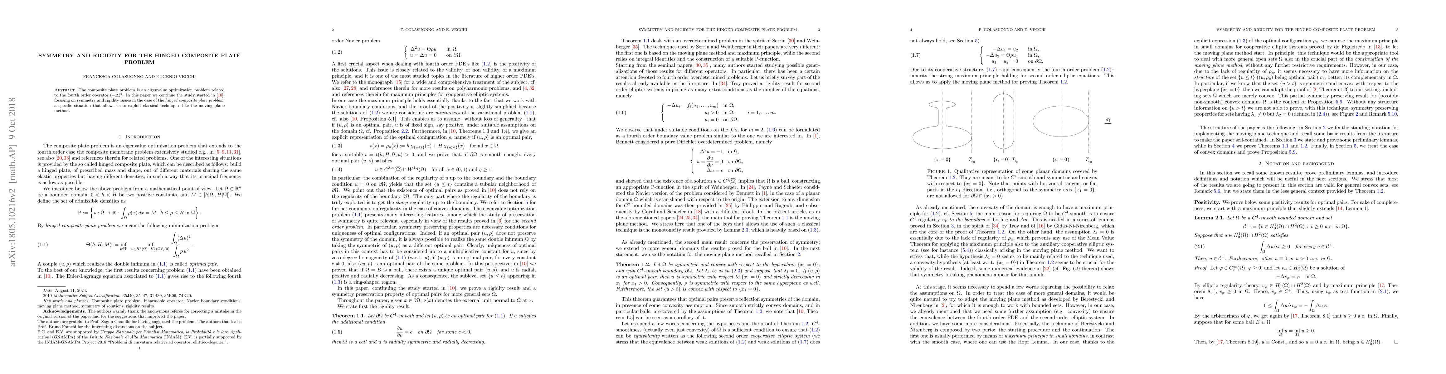 This paper investigates symmetry and rigidity in hinged composite plate problems using classical techniques like the moving plane method, focusing on key findings related to optimization of fourth-order operators.