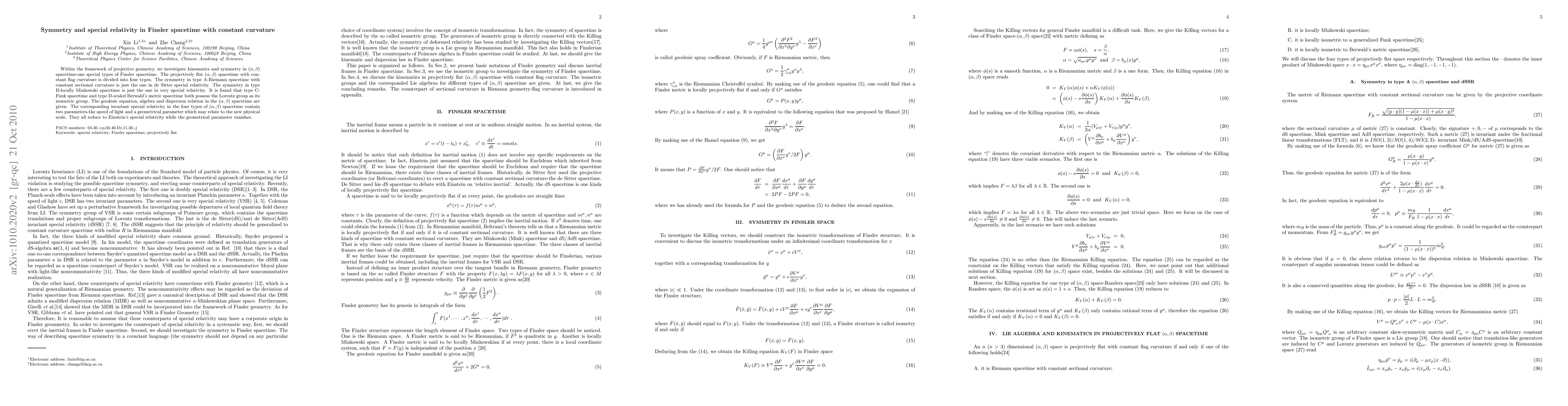 This research explores the symmetry and kinematics in $(\alpha,\beta)$ spacetime, a special type of Finsler spacetime with constant curvature. It identifies four types and finds that their symmetries relate to known relativity theories, reducing to Einstein's special relativity when a geometrical parameter vanishes.