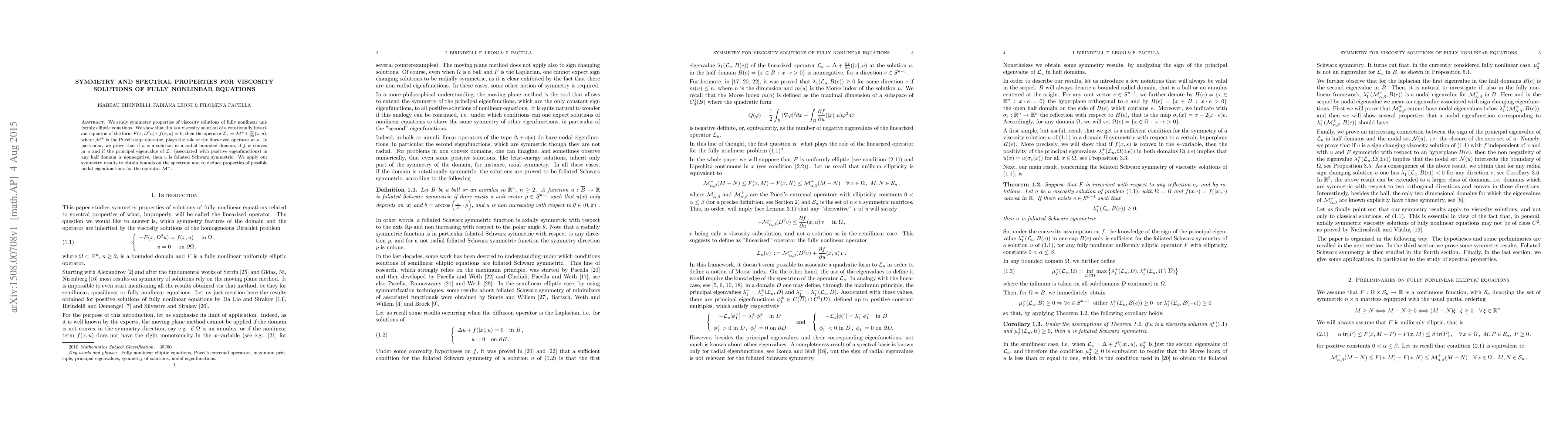 This paper investigates symmetry properties of viscosity solutions for fully nonlinear uniformly elliptic equations, proving that under certain conditions, solutions exhibit foliated Schwarz symmetry. It also derives bounds on the spectrum and properties of nodal eigenfunctions for the associated Pucci's sup-operator.