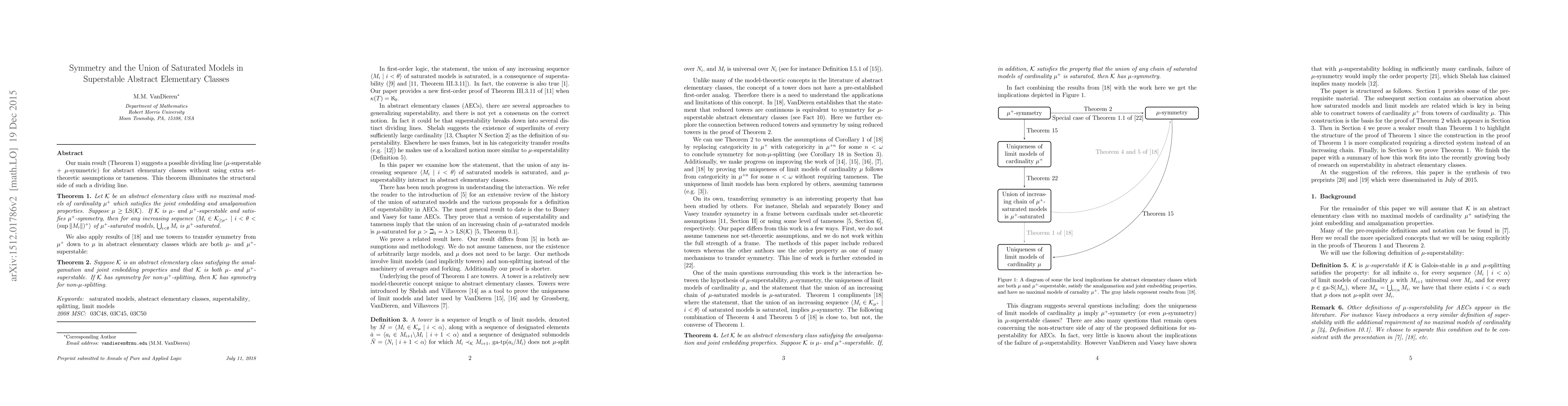 Our main result (Theorem 1) suggests a possible dividing line ($\mu$-superstable $+$ $\mu$-symmetric) for abstract elementary classes without using extra set-theoretic assumptions or tameness. This theorem illuminates the structural side of such a dividing line. Theoerem 1: Let $\mathcal{K}$ be an abstract elementary class with no maximal models of cardinality $\mu^+$ which satisfies the joint embedding and amalgamation properties. Suppose $\mu\geq LS(\mathcal{K})$. If $\mathcal{K}$ is $\mu$- and $\mu^+$-superstable and satisfies $\mu^+$-symmetry, then for any increasing sequence $\langle M_i\in\mathcal{K}_{\geq\mu^{+}}\mid i<\theta<(\sup\|M_i\|)^+\rangle$ of $\mu^+$-saturated models, $\bigcup_{i<\theta}M_i$ is $\mu^+$-saturated. We also apply results of VanDieren's Superstability and Symmetry paper and use towers to transfer symmetry from $\mu^+$ down to $\mu$ in abstract elementary classes which are both $\mu$- and $\mu^+$-superstable: Theorem 2: Suppose $\mathcal{K}$ is an abstract elementary class satisfying the amalgamation and joint embedding properties and that $\mathcal{K}$ is both $\mu$- and $\mu^+$-superstable. If $\mathcal{K}$ has symmetry for non-$\mu^+$-splitting, then $\mathcal{K}$ has symmetry for non-$\mu$-splitting.