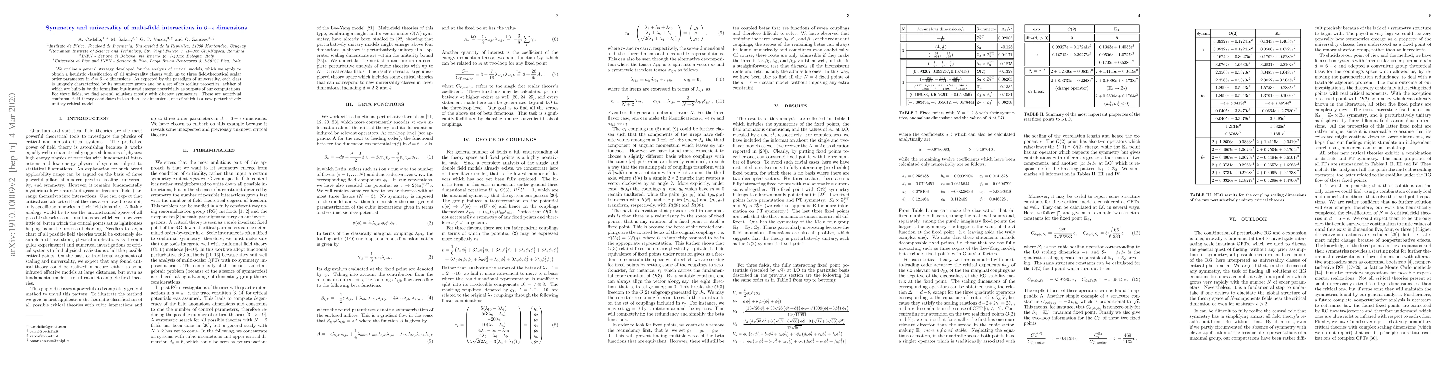 We outline a general strategy developed for the analysis of critical models, which we apply to obtain a heuristic classification of all universality classes with up to three field-theoretical scalar order parameters in $d=6-\epsilon$ dimensions. As expected by the paradigm of universality, each class is uniquely characterized by its symmetry group and by a set of its scaling properties, neither of which are built-in by the formalism but instead emerge nontrivially as outputs of our computations. For three fields, we find several solutions mostly with discrete symmetries. These are nontrivial conformal field theory candidates in less than six dimensions, one of which is a new perturbatively unitary critical model.