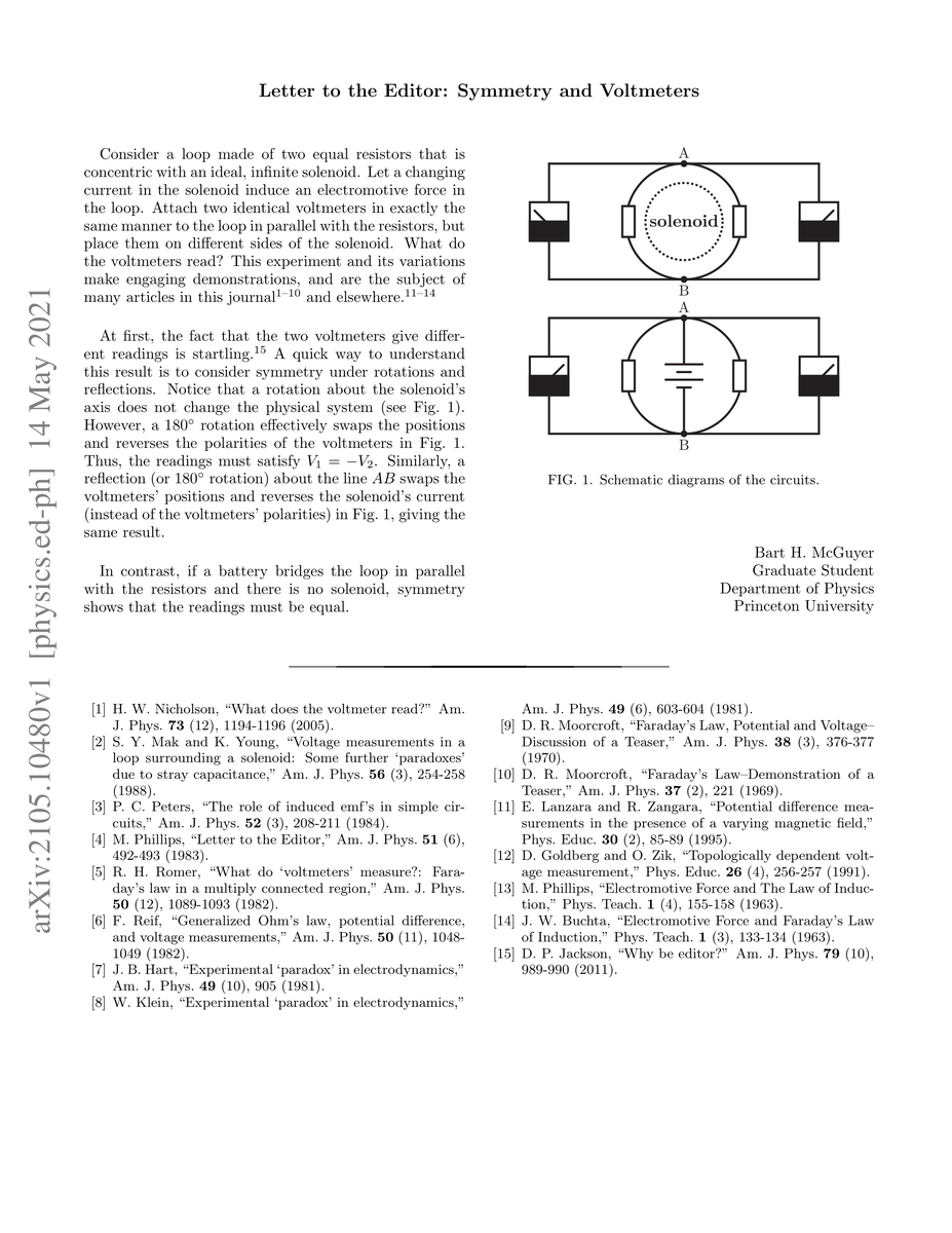 Summary: This letter elucidates a common physics demonstration involving voltmeters and electromotive force through the lens of symmetry, highlighting the underlying principles that govern the setup and observations.