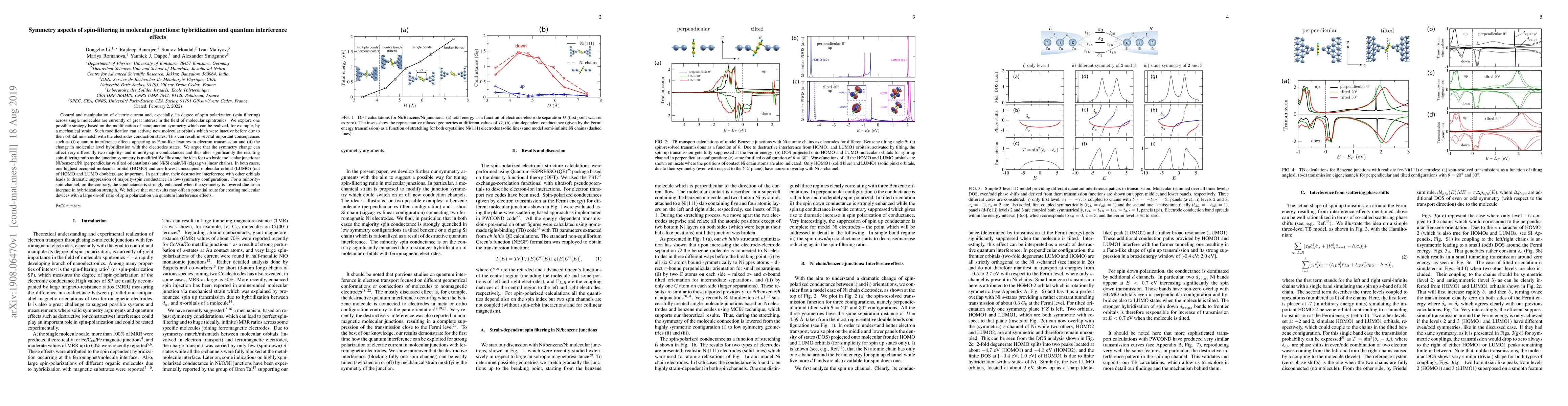 This paper investigates how altering the symmetry of molecular junctions via mechanical strain can significantly modify spin-filtering efficiency by activating new molecular orbitals and inducing quantum interference effects, thus potentially enhancing the on-off ratio of spin polarization in molecular devices. The study demonstrates these effects in two specific molecular junctions, showing that symmetry changes can dramatically suppress majority-spin conductance while enhancing minority-spin conductance.