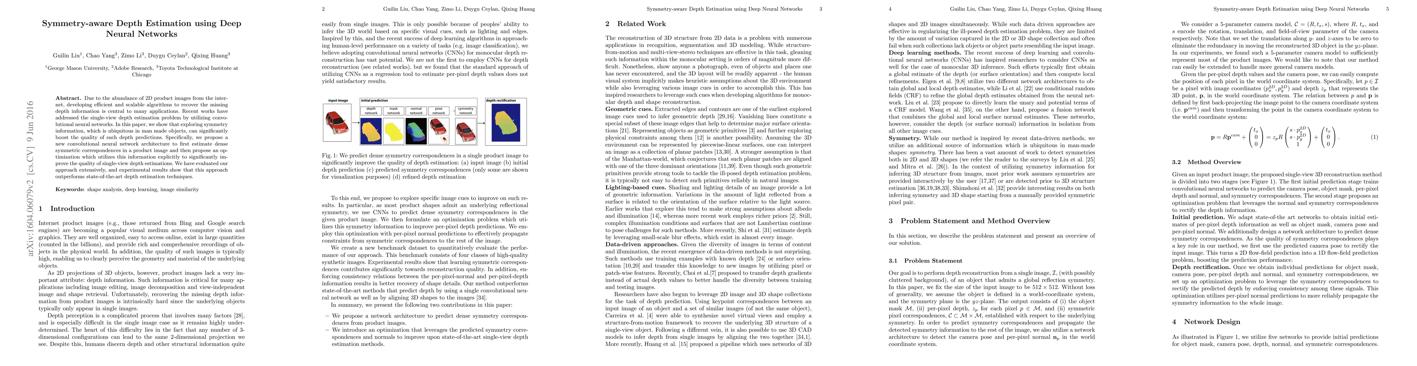 This paper proposes a convolutional neural network architecture that leverages symmetry information in product images to enhance single-view depth estimation. The method estimates dense symmetric correspondences and optimizes depth predictions using this information, outperforming existing state-of-the-art techniques.