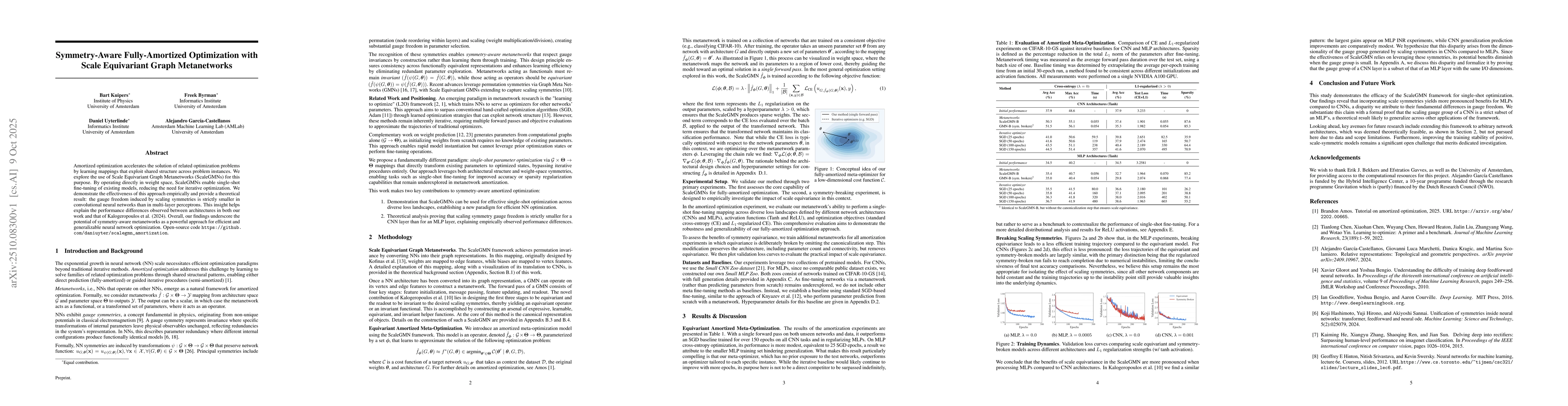 Amortized optimization accelerates the solution of related optimization problems by learning mappings that exploit shared structure across problem instances. We explore the use of Scale Equivariant Graph Metanetworks (ScaleGMNs) for this purpose. By operating directly in weight space, ScaleGMNs enable single-shot fine-tuning of existing models, reducing the need for iterative optimization. We demonstrate the effectiveness of this approach empirically and provide a theoretical result: the gauge freedom induced by scaling symmetries is strictly smaller in convolutional neural networks than in multi-layer perceptrons. This insight helps explain the performance differences observed between architectures in both our work and that of Kalogeropoulos et al. (2024). Overall, our findings underscore the potential of symmetry-aware metanetworks as a powerful approach for efficient and generalizable neural network optimization. Open-source code: https://github.com/daniuyter/scalegmn_amortization