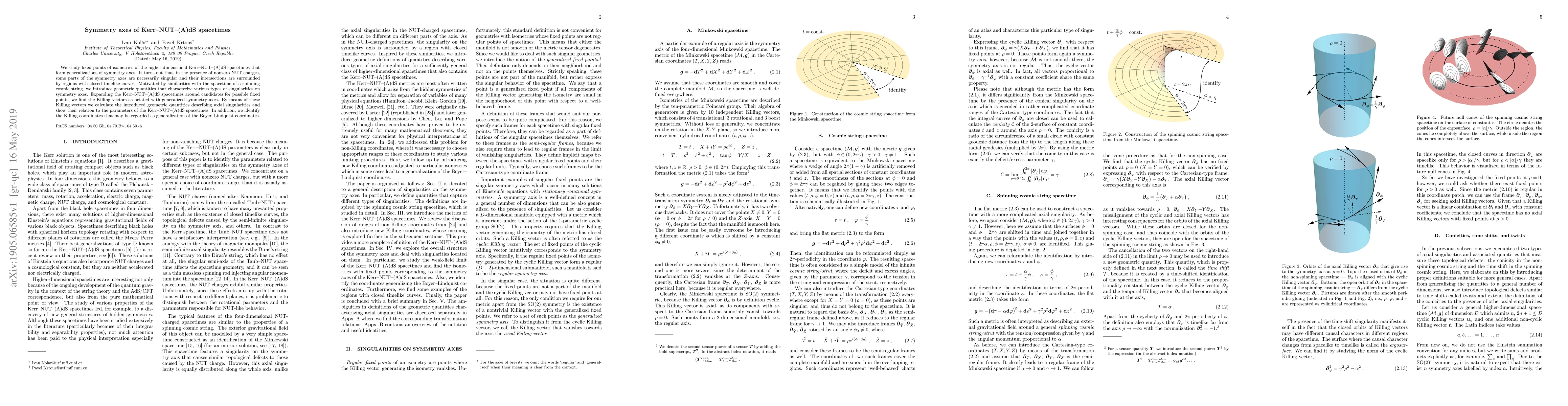 Summary: This paper investigates the symmetry axes in higher-dimensional Kerr-NUT-(A)dS spacetimes, revealing that nonzero NUT charges lead to singularities and closed timelike curves. It introduces geometric quantities to characterize these axial singularities and identifies Killing vectors and coordinates related to generalized symmetry axes.