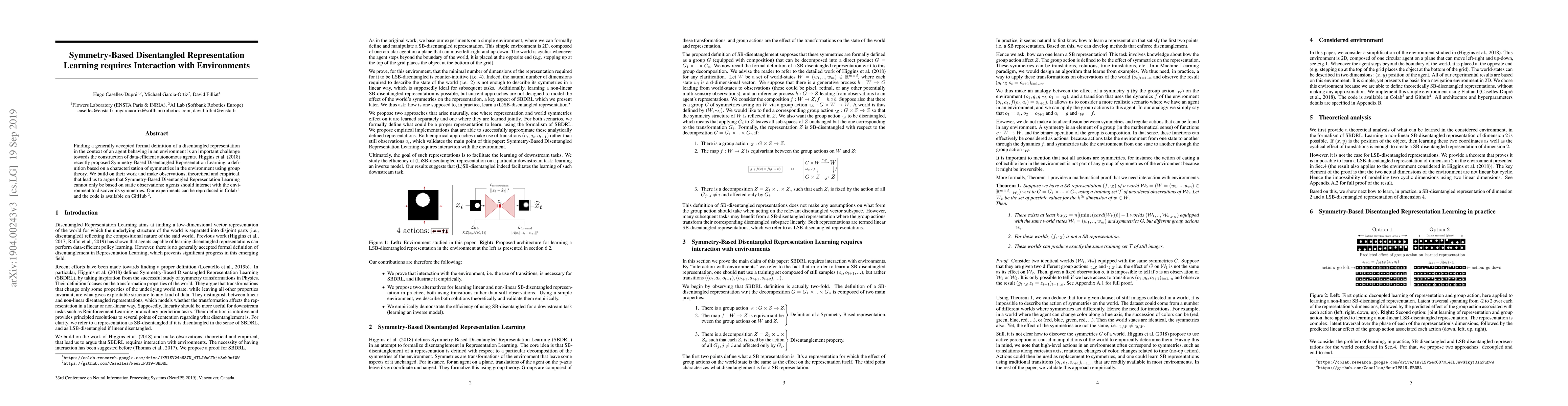 Finding a generally accepted formal definition of a disentangled representation in the context of an agent behaving in an environment is an important challenge towards the construction of data-efficient autonomous agents. Higgins et al. recently proposed Symmetry-Based Disentangled Representation Learning, a definition based on a characterization of symmetries in the environment using group theory. We build on their work and make observations, theoretical and empirical, that lead us to argue that Symmetry-Based Disentangled Representation Learning cannot only be based on static observations: agents should interact with the environment to discover its symmetries. Our experiments can be reproduced in Colab and the code is available on GitHub.