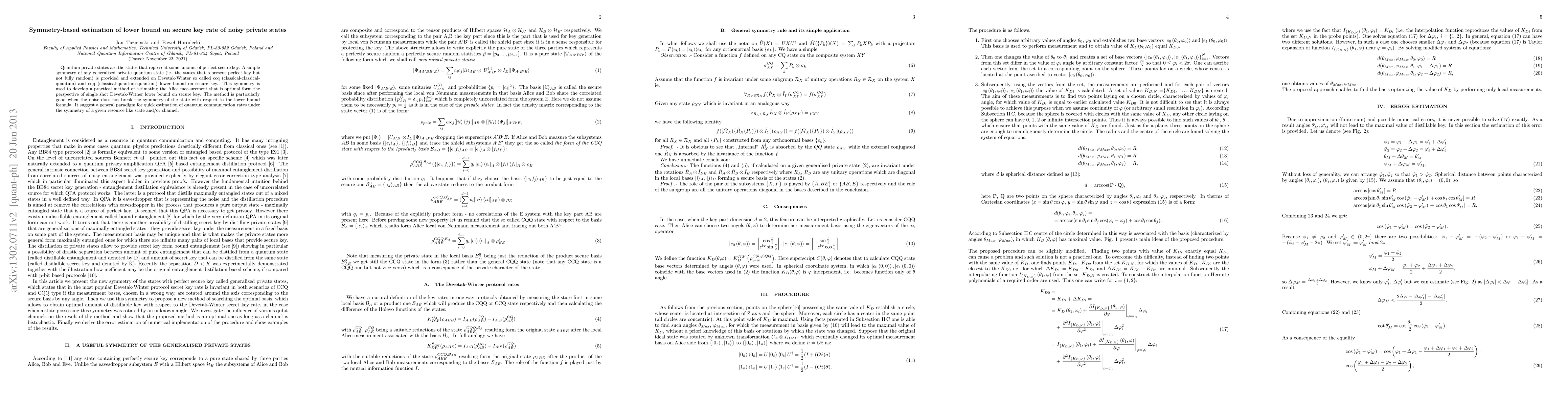 Quantum private states are the states that represent some amount of perfect secure key. A simple symmetry of any generalised private quantum state (ie. the states that represent perfect key but not fully random) is provided and extended on Devetak-Winter so called ccq (classical-classical-quantum) and cqq (classical-quantum-quantum) lower bound on secure key. This symmetry is used to develop a practical method of estimating the Alice measurement that is optimal form the perspective of single shot Devetak-Witner lower bound on secure key. The method is particularly good when the noise does not break the symmetry of the state with respect to the lower bound formula. It suggest a general paradigm for quick estimation of quantum communication rates under the symmetry of a given resource like state and/or channel.