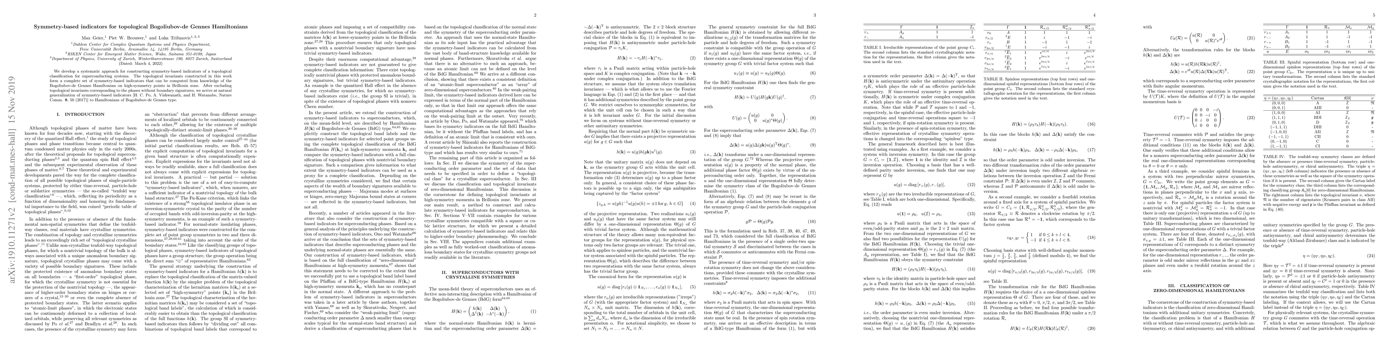 This paper develops a systematic method to create symmetry-based indicators for classifying topological phases in superconducting systems. The indicators are derived from the Bogoliubov-de Gennes Hamiltonian at high-symmetry points in the Brillouin zone, excluding phases without boundary signatures.