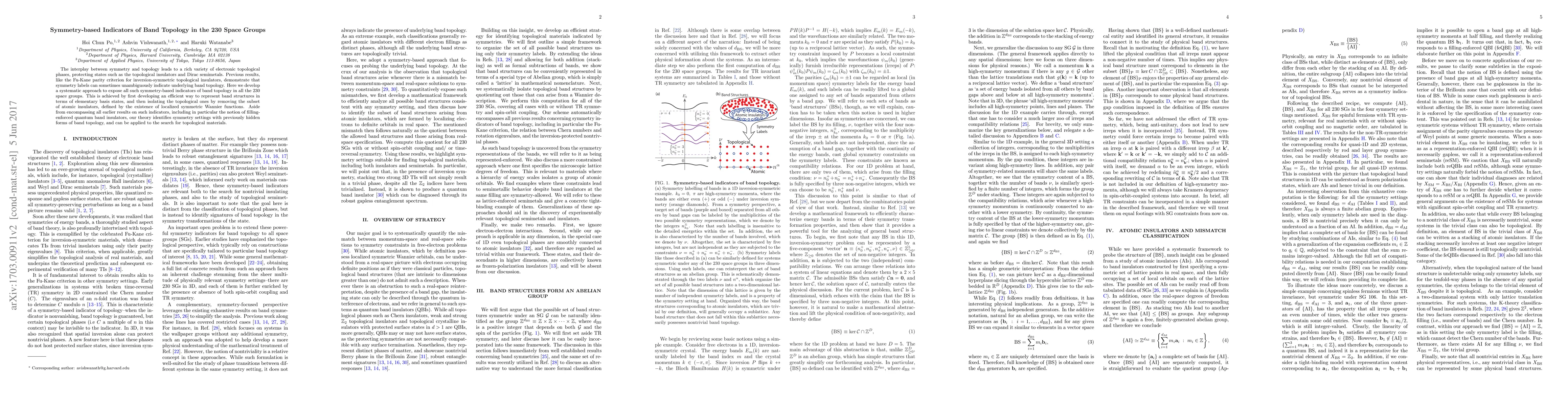 The interplay between symmetry and topology leads to a rich variety of electronic topological phases, protecting states such as the topological insulators and Dirac semimetals. Previous results, like the Fu-Kane parity criterion for inversion-symmetric topological insulators, demonstrate that symmetry labels can sometimes unambiguously indicate underlying band topology. Here we develop a systematic approach to expose all such symmetry-based indicators of band topology in all the 230 space groups. This is achieved by first developing an efficient way to represent band structures in terms of elementary basis states, and then isolating the topological ones by removing the subset of atomic insulators, defined by the existence of localized symmetric Wannier functions. Aside from encompassing all earlier results on such indicators, including in particular the notion of filling-enforced quantum band insulators, our theory identifies symmetry settings with previously hidden forms of band topology, and can be applied to the search for topological materials.