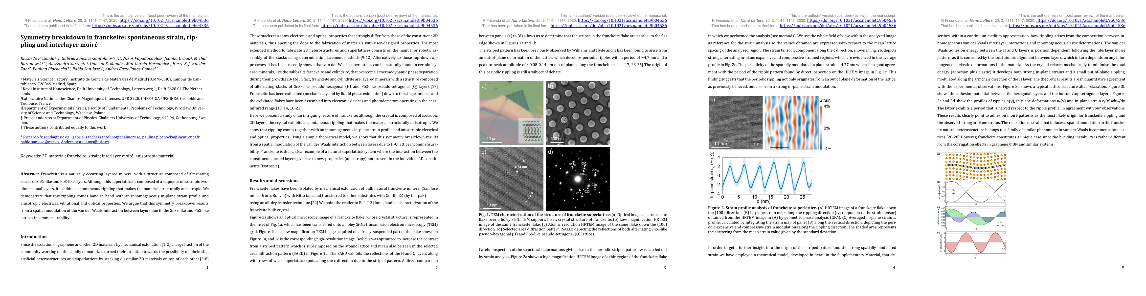 Franckeite is a naturally occurring layered mineral with a structure composed of alternating stacks of SnS2-like and PbS-like layers. Although this superlattice is composed of a sequence of isotropic two-dimensional layers, it exhibits a spontaneous rippling that makes the material structurally anisotropic. We demonstrate that this rippling comes hand in hand with an inhomogeneous in-plane strain profile and anisotropic electrical, vibrational and optical properties. We argue that this symmetry breakdown results from a spatial modulation of the van der Waals interaction between layers due to the SnS2-like and PbS-like lattices incommensurability.