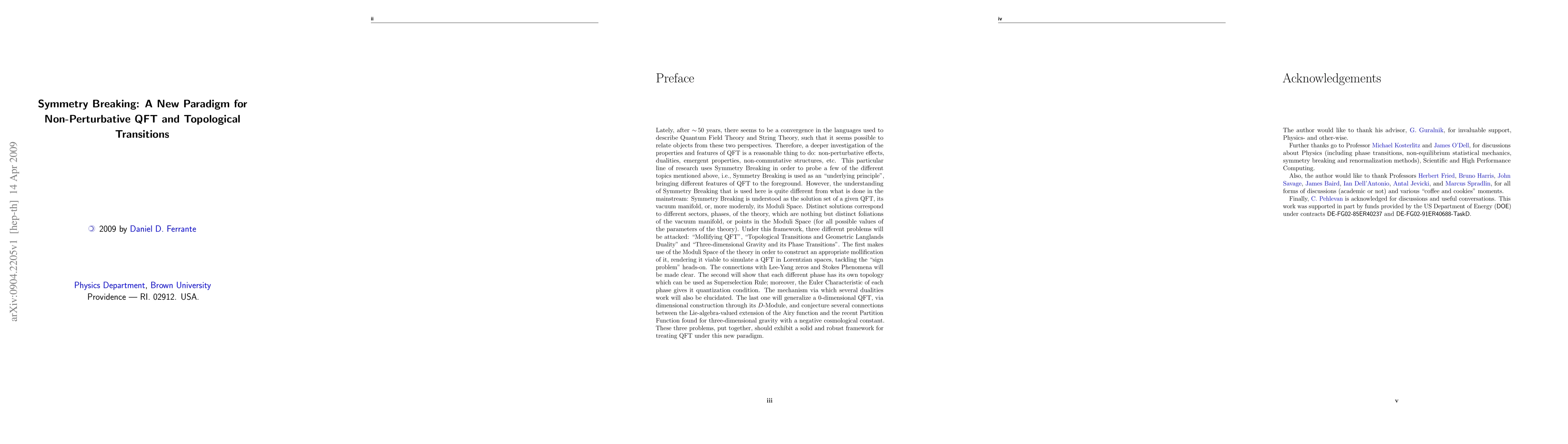 Symmetry Breaking is used as an "underlying principle", bringing different features of QFT to the foreground. However, the understanding of Symmetry Breaking that is used here is quite different from what is done in the mainstream: Symmetry Breaking is understood as the solution set of a given QFT, its vacuum manifold, or, more modernly, its Moduli Space. Distinct solutions correspond to different sectors, phases, of the theory, which are nothing but distinct foliations of the vacuum manifold, or points in the Moduli Space (for all possible values of the parameters of the theory). Under this framework, three different problems will be attacked: "Mollifying QFT", "Topological Transitions and Geometric Langlands Duality" and "Three-dimensional Gravity and its Phase Transitions". The first makes use of the Moduli Space of the theory in order to construct an appropriate mollification of it, rendering it viable to simulate a QFT in Lorentzian spaces, tackling the "sign problem" heads-on. The connections with Lee-Yang zeros and Stokes Phenomena will be made clear. The second will show that each different phase has its own topology which can be used as Superselection Rule; moreover, the Euler Characteristic of each phase gives it quantization condition. The mechanism via which several dualities work will also be elucidated. The last one will generalize a 0-dimensional QFT, via dimensional construction through its D-Module, and conjecture several connections between the Lie-algebra-valued extension of the Airy function and the recent Partition Function found for three-dimensional gravity with a negative cosmological constant. These three problems, put together, should exhibit a solid and robust framework for treating QFT under this new paradigm.