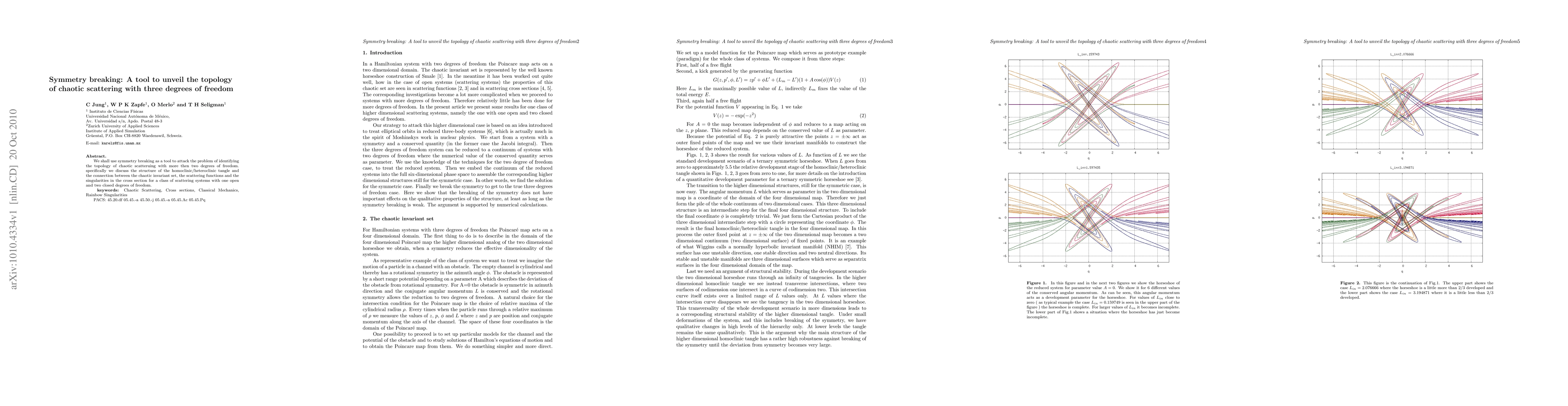 We shall use symmetry breaking as a tool to attack the problem of identifying the topology of chaotic scatteruing with more then two degrees of freedom. specifically we discuss the structure of the homoclinic/heteroclinic tangle and the connection between the chaotic invariant set, the scattering functions and the singularities in the cross section for a class of scattering systems with one open and two closed degrees of freedom.