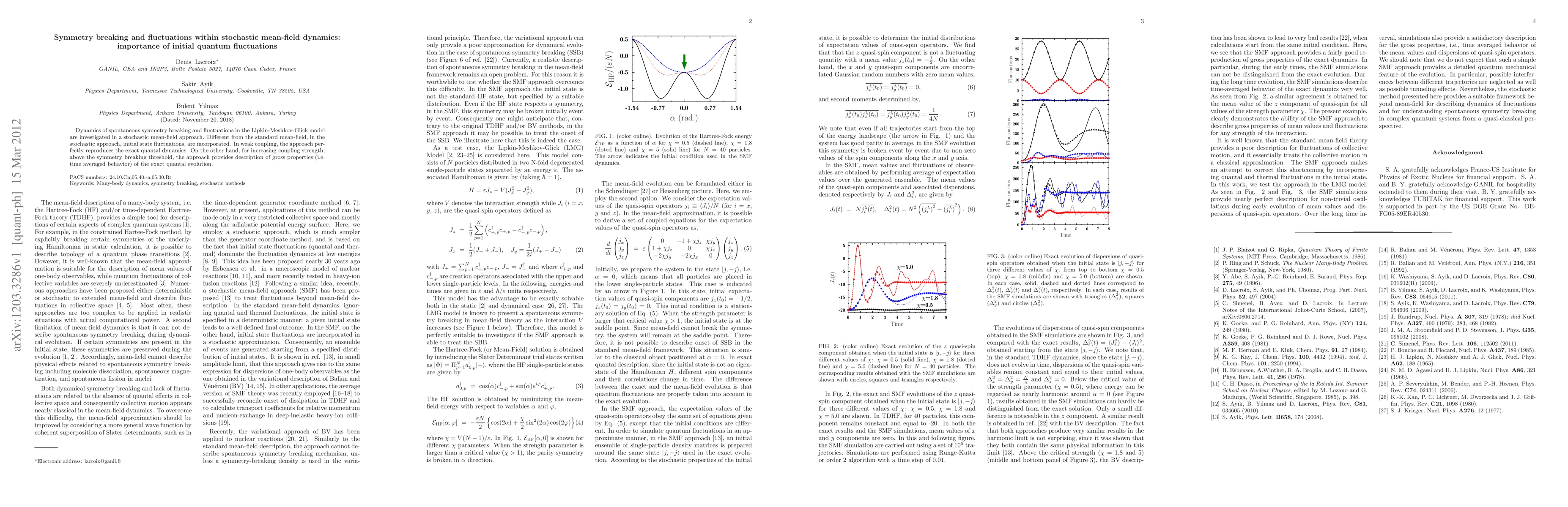 This paper investigates the dynamics of spontaneous symmetry breaking and fluctuations in the Lipkin-Meshkov-Glick model using a stochastic mean-field approach that incorporates initial quantum fluctuations. It shows that the stochastic method accurately reproduces exact quantal dynamics in weak coupling and provides a good description of the time-averaged behavior in stronger coupling.