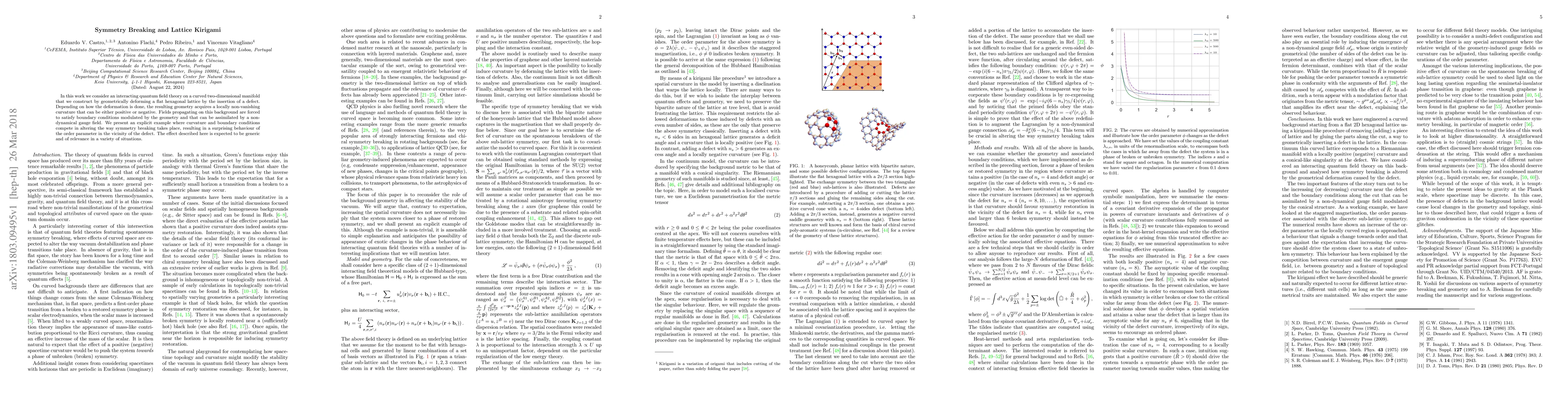In this work we consider an interacting quantum field theory on a curved two-dimensional manifold that we construct by geometrically deforming a flat hexagonal lattice by the insertion of a defect. Depending on how the deformation is done, the resulting geometry acquires a locally non-vanishing curvature that can be either positive or negative. Fields propagating on this background are forced to satisfy boundary conditions modulated by the geometry and that can be assimilated by a non-dynamical gauge field. We present an explicit example where curvature and boundary conditions compete in altering the way symmetry breaking takes place, resulting in a surprising behaviour of the order parameter in the vicinity of the defect. The effect described here is expected to be generic and of relevance in a variety of situations.