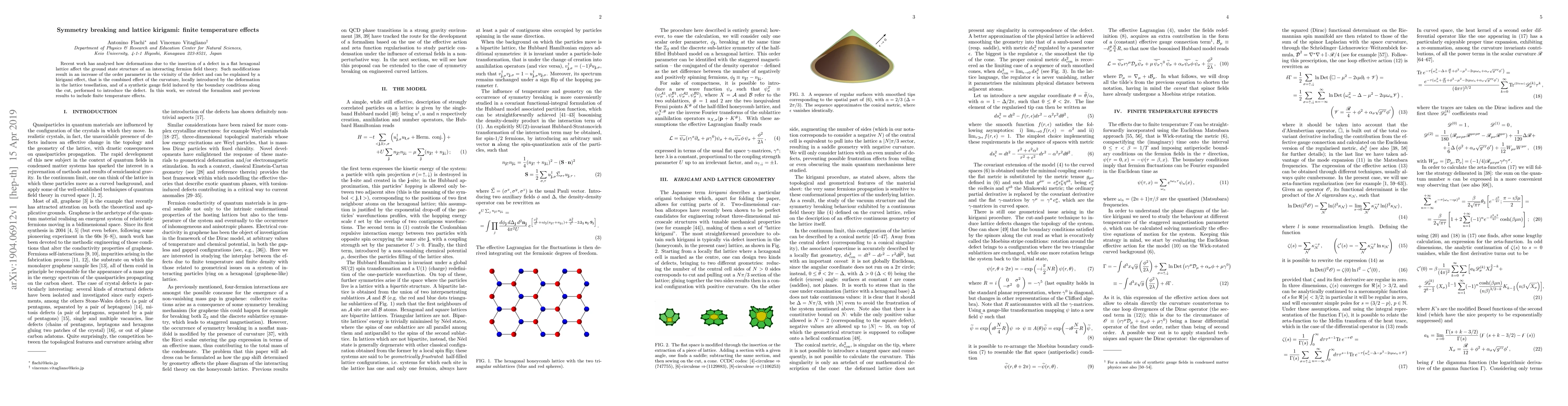 This research extends previous findings on lattice deformations affecting fermion field theory, incorporating finite temperature effects. It builds on the 'kirigami effect', explaining how lattice curvature and synthetic gauge fields influence order parameters near defects at varying temperatures.