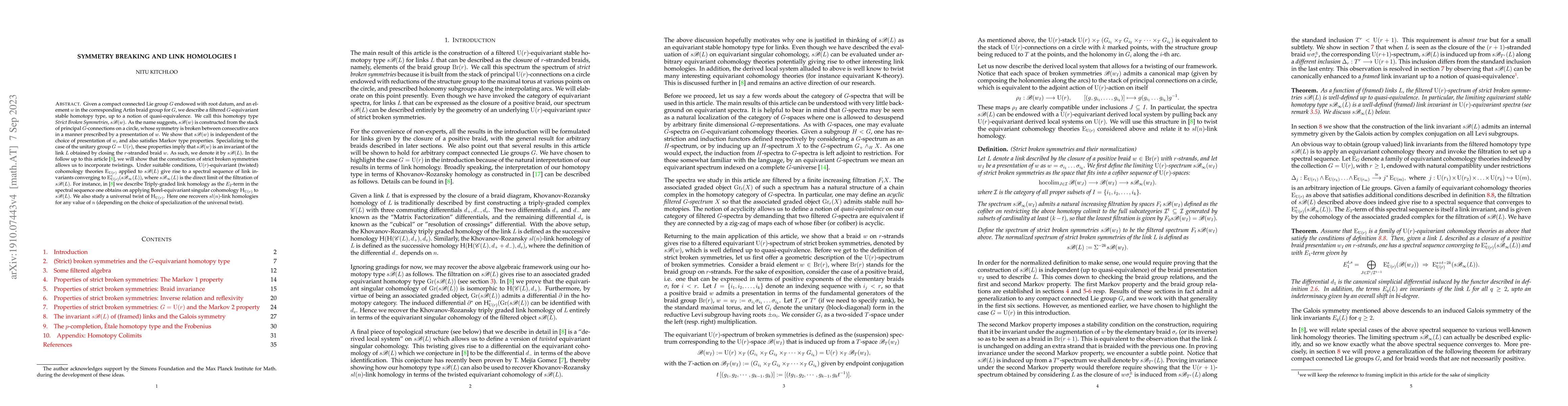 Given a compact connected Lie group G endowed with root datum, and an element w in the corresponding Artin braid group for G, we describe a filtered G-equivariant stable homotopy type, up to a notion of quasi-equivalence. We call this homotopy type Strict Broken Symmetries, sB(w). As the name suggests, sB(w) is constructed from the stack of principal G-connections on a circle, whose symmetry is broken between consecutive arcs in a manner prescribed by a presentation of w. We show that sB(w) is independent of the choice of presentation of w, and also satisfies Markov type properties. Specializing to the case of the unitary group G = U(r), these properties imply that sB(w) is an invariant of the link L obtained by closing the r-stranded braid w. As such, we denote it by sB(L). In the follow up to this article, we will show that the construction of strict broken symmetries allows us to incorporate twistings. Under suitable conditions, U(r)-equivariant (twisted) cohomology theories EU(r) applied to sB(L) give rise to a spectral sequence of link invariants converging to the cohomology of the direct limit of the filtration of sB(L). For instance we describe Triply-graded link homology as the E2-term in the spectral sequence one obtains on applying Borel-equivariant singular cohomology HU(r) to sB(L). We also study a universal twist of HU(r). Here one recovers sl(n)-link homologies for any value of n (depending on the choice of specialization of the universal twist).