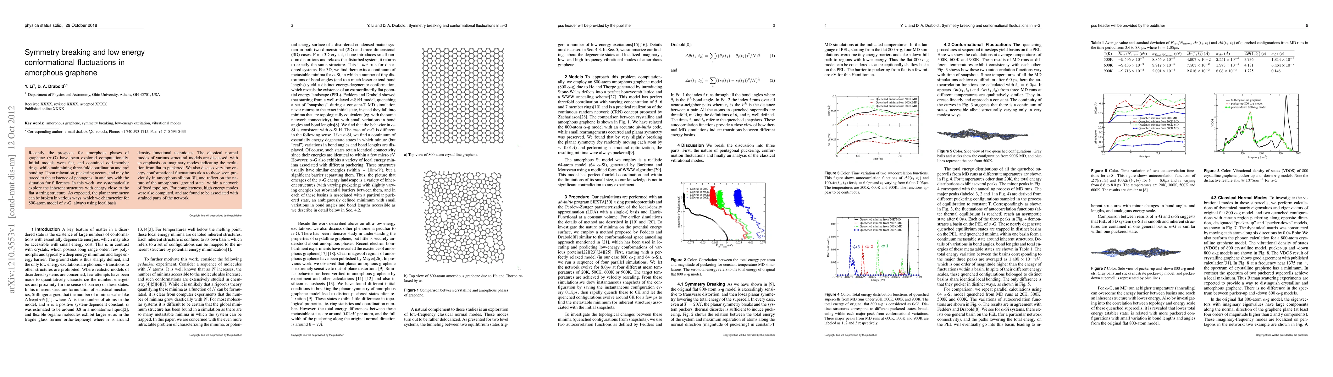 Recently, the prospects for amorphous phases of graphene (a-G) have been explored computationally. Initial models were flat, and contained odd-member rings, while maintaining three-fold coordination and sp2 bonding. Upon relaxation, puckering occurs, and may be traced to the existence of pentagons, in analogy with the situation for fullerenes. In this work, we systematically explore the inherent structures with energy close to the flat starting structure. As expected, the planar symmetry can be broken in various ways, which we characterize for 800-atom model of a-G, always using local basis density functional techniques. The classical normal modes of various structural models are discussed, with an emphasis on imaginary modes indicating the evolution from flat to puckered. We also discuss very low energy conformational fluctuations akin to those seen previously in amorphous silicon, and reflect on the nature of the amorphous "ground state" within a network of fixed topology. For completeness, high energy modes were also computed, and are found to be associated with strained parts of the network.