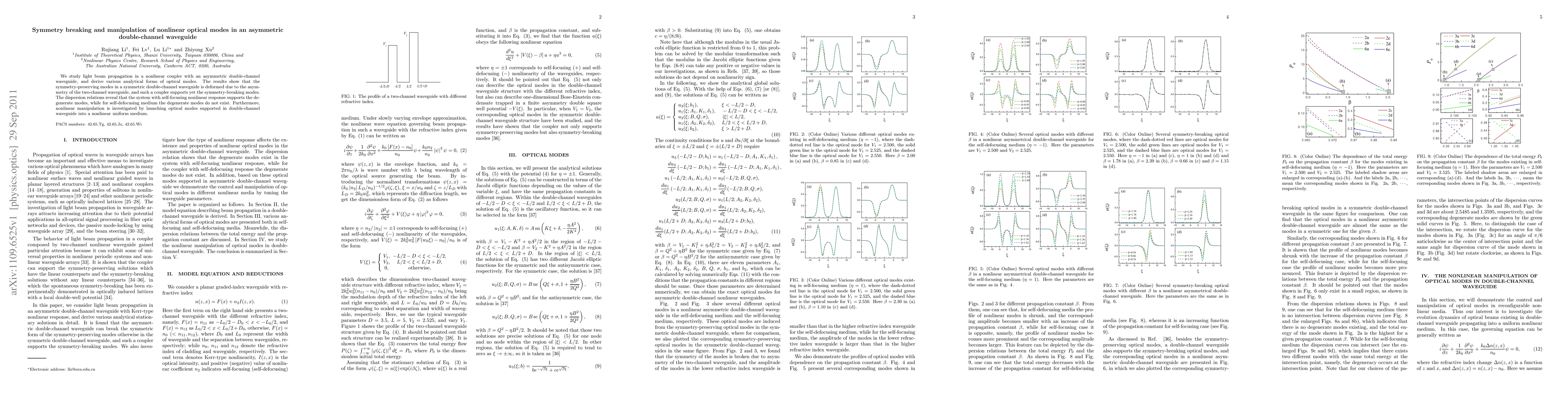 This paper explores light propagation in an asymmetric double-channel waveguide, demonstrating how symmetry-breaking modes emerge due to waveguide asymmetry. It reveals that while self-focusing supports degenerate modes, self-defocusing does not, and investigates nonlinear manipulation of optical modes in a uniform medium.