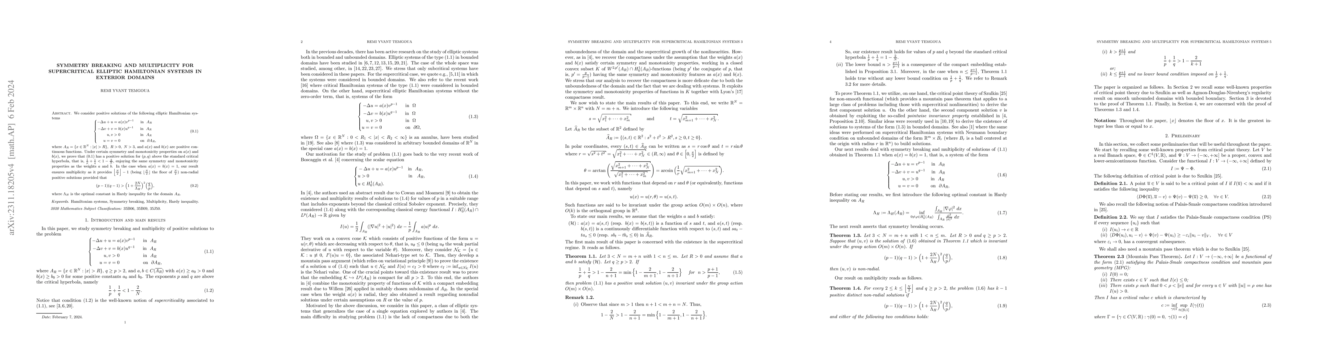 This paper investigates positive solutions for supercritical elliptic Hamiltonian systems in exterior domains, proving the existence of solutions above the standard critical hyperbola under specific symmetry and monotonicity conditions. It also demonstrates multiplicity, yielding $\Big\lfloor \frac{N}{2}\Big\rfloor-1$ non-radial solutions when coefficients are equal and certain inequalities are satisfied.