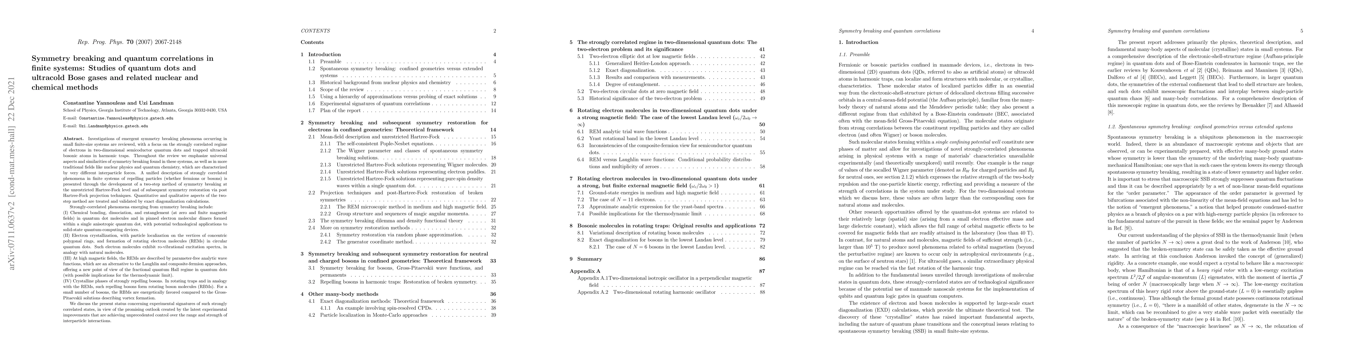 Investigations of emergent symmetry breaking phenomena occurring in small finite-size systems are reviewed, with a focus on the strongly correlated regime of electrons in two-dimensional semicoductor quantum dots and trapped ultracold bosonic atoms in harmonic traps. Throughout the review we emphasize universal aspects and similarities of symmetry breaking found in these systems, as well as in more traditional fields like nuclear physics and quantum chemistry, which are characterized by very different interparticle forces. A unified description of strongly correlated phenomena in finite systems of repelling particles (whether fermions or bosons) is presented through the development of a two-step method of symmetry breaking at the unrestricted Hartree-Fock level and of subsequent symmetry restoration via post Hartree-Fock projection techniques. Quantitative and qualitative aspects of the two-step method are treated and validated by exact diagonalization calculations. Strongly-correlated phenomena emerging from symmetry breaking include: (I) Chemical bonding, dissociation, and entanglement (at zero and finite magnetic fields) in quantum dot molecules and in pinned electron molecular dimers formed within a single anisotropic quantum dot. (II) Electron crystallization, with particle localization on the vertices of concentric polygonal rings, and formation of rotating electron molecules (REMs) in circular quantum dots. (III) At high magnetic fields, the REMs are described by parameter-free analytic wave functions, which are an alternative to the Laughlin and composite-fermion approaches. (IV) Crystalline phases of strongly repelling bosons. In rotating traps and in analogy with the REMs, such repelling bosons form rotating boson molecules (RBMs).