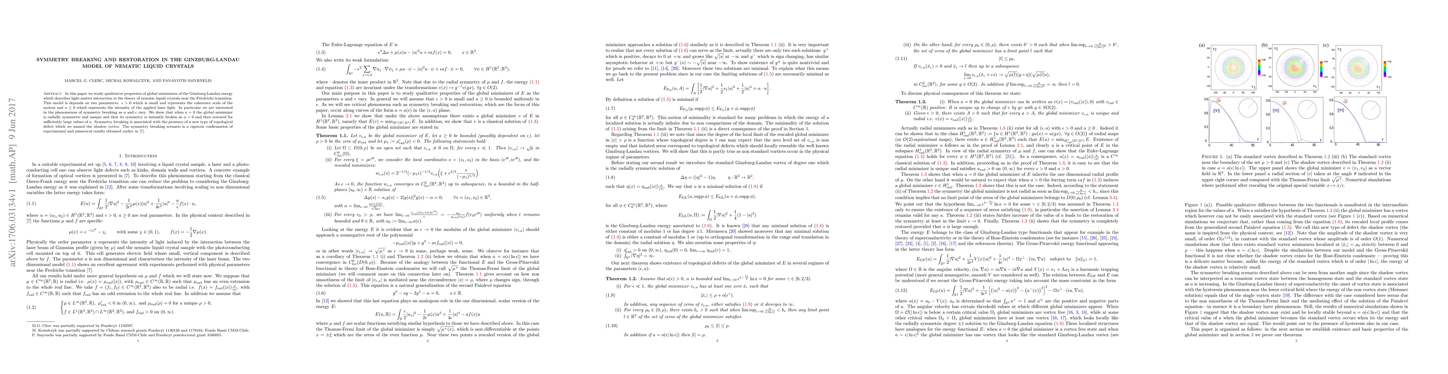 In this paper we study qualitative properties of global minimizers of the Ginzburg-Landau energy which describes light-matter interaction in the theory of nematic liquid crystals near the Friedrichs transition. This model is depends on two parameters: $\epsilon>0$ which is small and represents the coherence scale of the system and $a\geq 0$ which represents the intensity of the applied laser light. In particular we are interested in the phenomenon of symmetry breaking as $a$ and $\epsilon$ vary. We show that when $a=0$ the global minimizer is radially symmetric and unique and that its symmetry is instantly broken as $a>0$ and then restored for sufficiently large values of $a$. Symmetry breaking is associated with the presence of a new type of topological defect which we named the shadow vortex. The symmetry breaking scenario is a rigorous confirmation of experimental and numerical results obtained in our earlier work.
