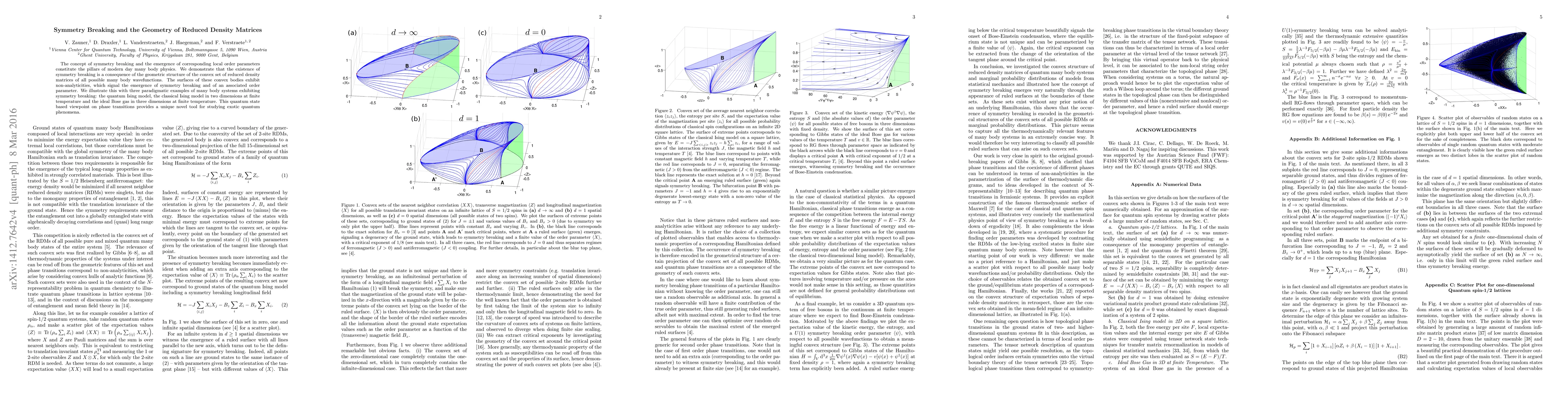 The concept of symmetry breaking and the emergence of corresponding local order parameters constitute the pillars of modern day many body physics. The theory of quantum entanglement is currently leading to a paradigm shift in understanding quantum correlations in many body systems and in this work we show how symmetry breaking can be understood from this wavefunction centered point of view. We demonstrate that the existence of symmetry breaking is a consequence of the geometric structure of the convex set of reduced density matrices of all possible many body wavefunctions. The surfaces of those convex bodies exhibit non-analytic behavior in the form of ruled surfaces, which turn out to be the defining signatures for the emergence of symmetry breaking and of an associated order parameter. We illustrate this by plotting the convex sets arising in the context of three paradigmatic examples of many body systems exhibiting symmetry breaking: the quantum Ising model in transverse magnetic field, exhibiting a second order quantum phase transition; the classical Ising model at finite temperature in two dimensions, which orders below a critical temperature $T_c$; and a system of free bosons at finite temperature in three dimensions, exhibiting the phenomenon of Bose-Einstein condensation together with an associated order parameter $\langle\psi\rangle$. Remarkably, these convex sets look all very much alike. We believe that this wavefunction based way of looking at phase transitions demystifies the emergence of order parameters and provides a unique novel tool for studying exotic quantum phenomena.