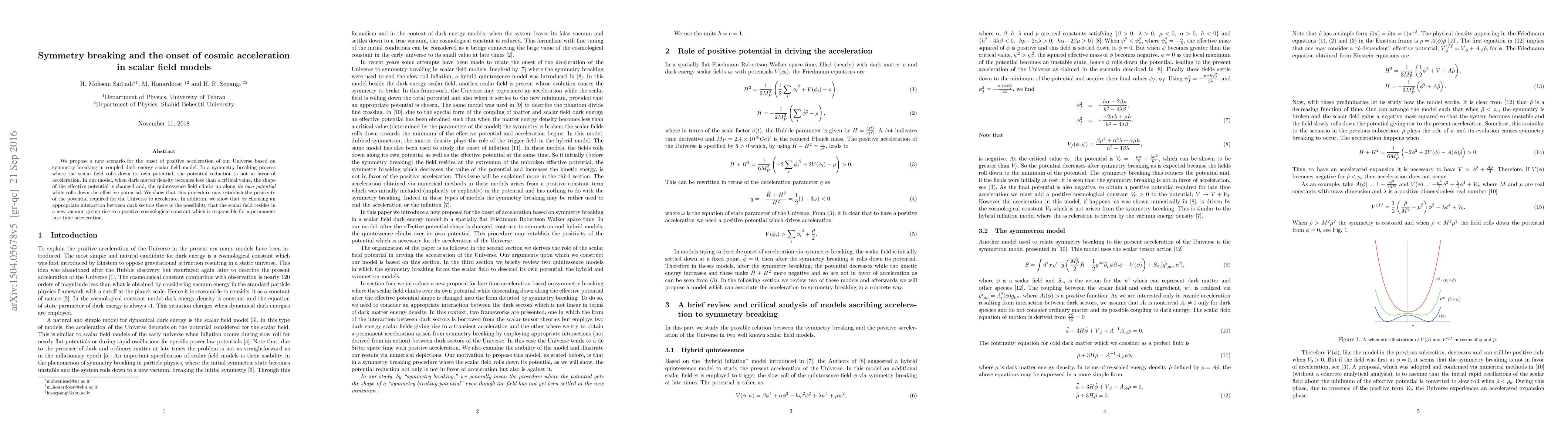 We propose a new scenario for the onset of positive acceleration of our Universe based on symmetry breaking in coupled dark energy scalar field model. In a symmetry breaking process where the scalar field rolls down its own potential, the potential reduction is not in favor of acceleration. In our model, when dark matter density becomes less than a critical value, the shape of the effective potential is changed and, the quintessence field climbs up along {\it{its own potential}} while rolls down the effective potential. We show that this procedure may establish the positivity of the potential required for the Universe to accelerate. In addition, we show that by choosing an appropriate interaction between dark sectors there is the possibility that the scalar field resides in a new vacuum giving rise to a positive cosmological constant which is responsible for a permanent late time acceleration.