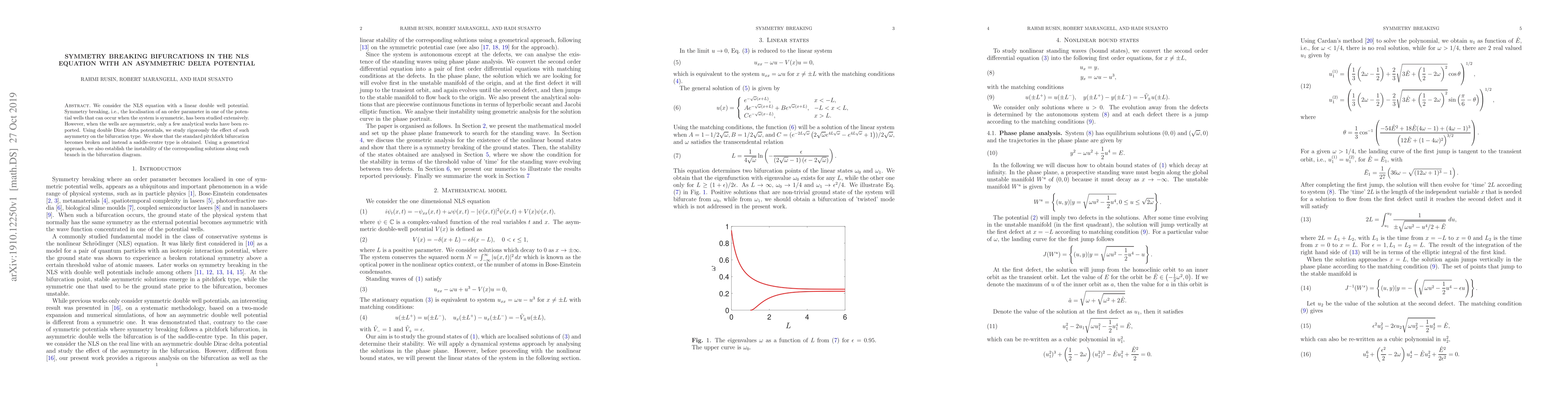 We consider the NLS equation with a linear double well potential. Symmetry breaking, i.e., the localisation of an order parameter in one of the potential wells that can occur when the system is symmetric, has been studied extensively. However, when the wells are asymmetric, only a few analytical works have been reported. Using double Dirac delta potentials, we study rigorously the effect of such asymmetry on the bifurcation type. We show that the standard pitchfork bifurcation becomes broken and instead a saddle-centre type is obtained. Using a geometrical approach, we also establish the instability of the corresponding solutions along each branch in the bifurcation diagram