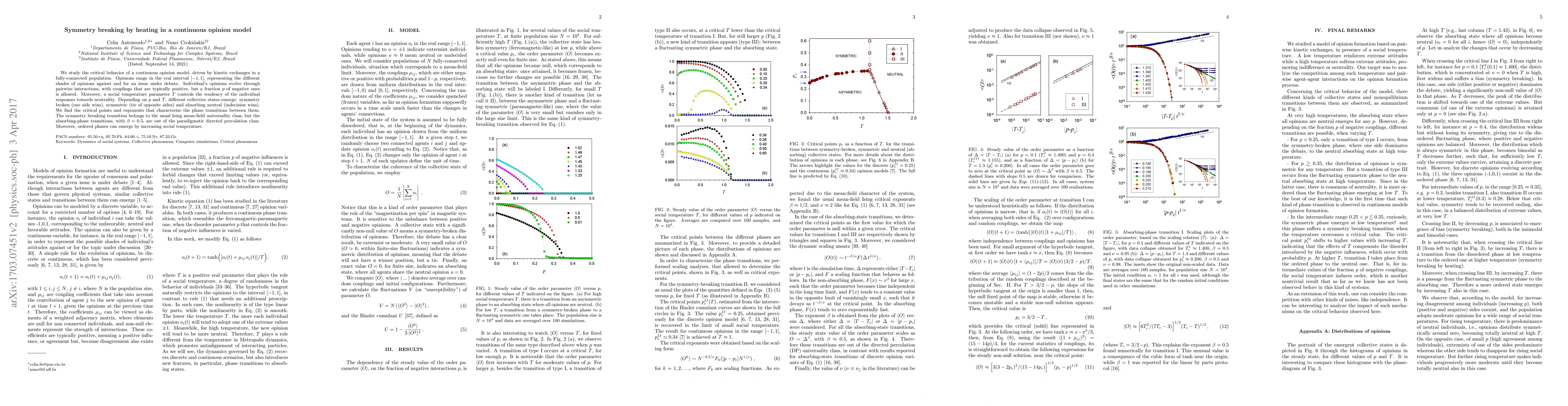 A continuous opinion model reveals that varying social temperature can lead to symmetry breaking, symmetric, and absorbing neutral phases in a fully-connected population. The critical behavior of the system is characterized by phase transitions between these states.
