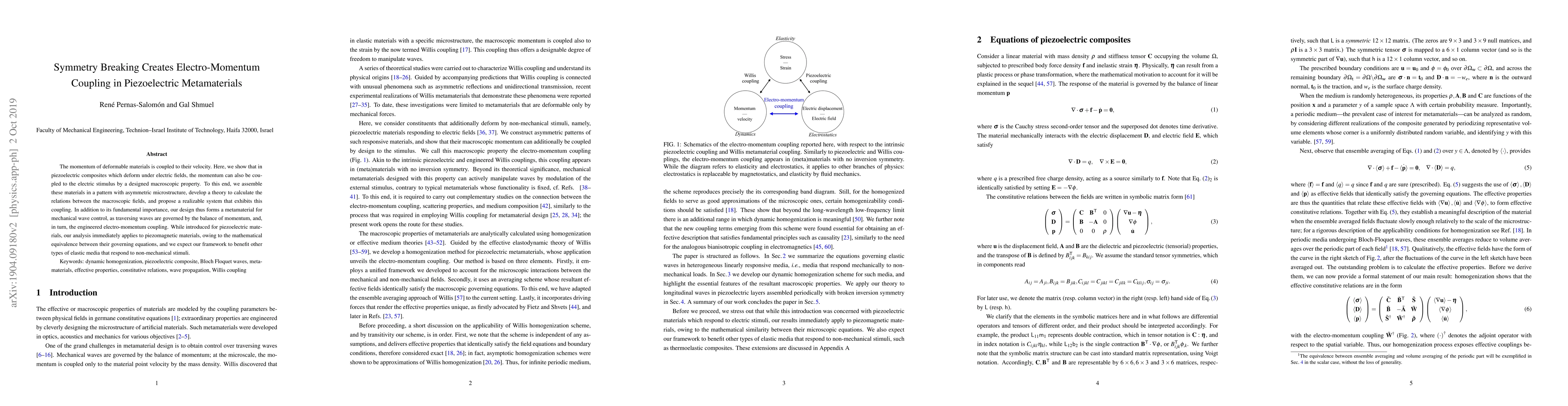 This paper introduces a homogenization method to reveal new electro-momentum couplings in piezoelectric metamaterials, analogous to Willis coupling in mechanics. The study demonstrates that symmetry breaking can induce coupling between velocity and electric fields, offering new pathways for active wave control via external stimuli.