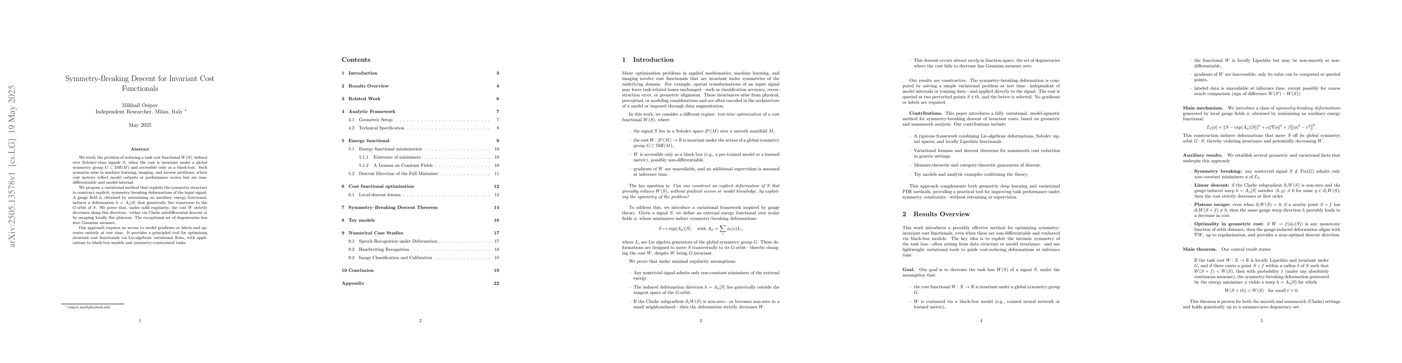 The introduction of a gauge field φ to induce symmetry-breaking deformations and prove strict cost decrease under mild regularity conditions.