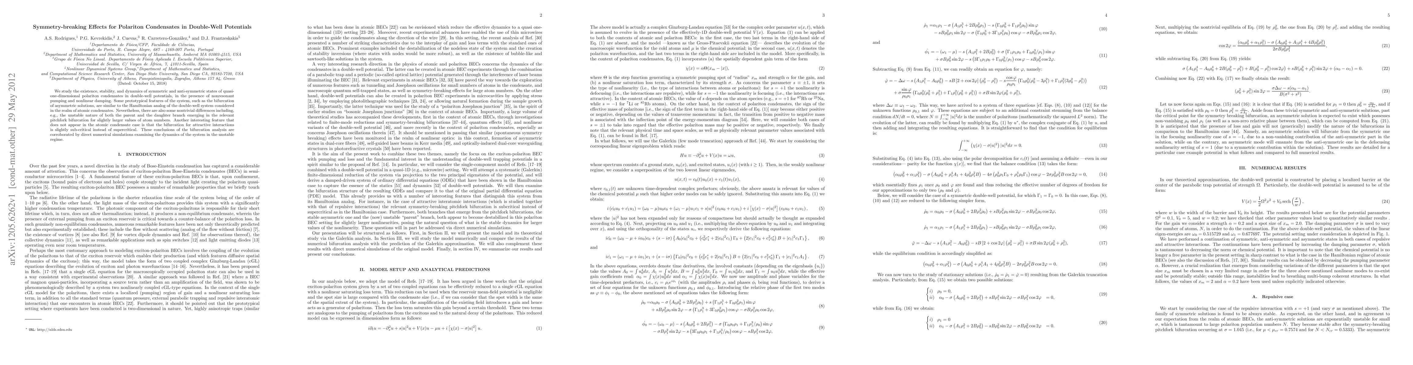 We study the existence, stability, and dynamics of symmetric and anti-symmetric states of quasi-one-dimensional polariton condensates in double-well potentials, in the presence of nonresonant pumping and nonlinear damping. Some prototypical features of the system, such as the bifurcation of asymmetric solutions, are similar to the Hamiltonian analog of the double-well system considered in the realm of atomic condensates. Nevertheless, there are also some nontrivial differences including, e.g., the unstable nature of both the parent and the daughter branch emerging in the relevant pitchfork bifurcation for slightly larger values of atom numbers. Another interesting feature that does not appear in the atomic condensate case is that the bifurcation for attractive interactions is slightly sub-critical instead of supercritical. These conclusions of the bifurcation analysis are corroborated by direct numerical simulations examining the dynamics of the system in the unstable regime.