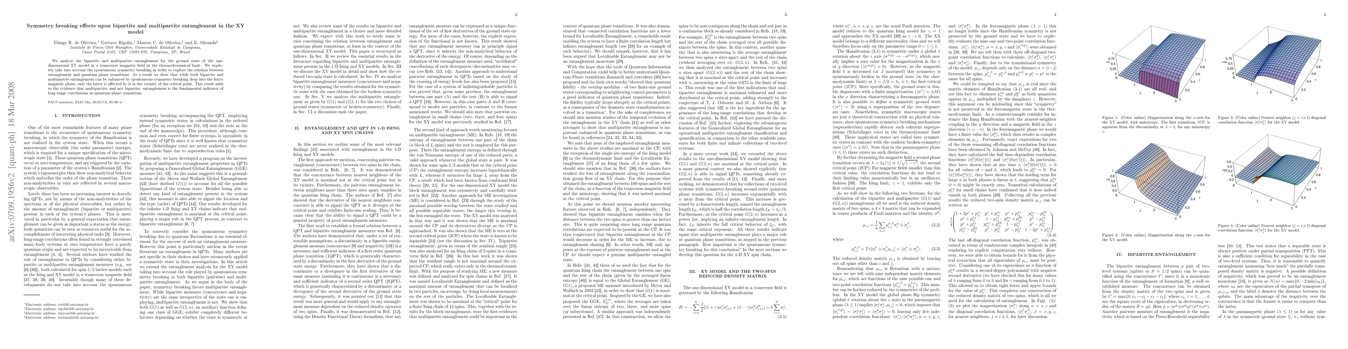 This paper investigates how spontaneous symmetry breaking influences the entanglement in the XY model, revealing that while both bipartite and multipartite entanglement increase in the ferromagnetic phase, only multipartite entanglement is affected near the critical point, suggesting multipartite entanglement as a key indicator of quantum phase transitions.