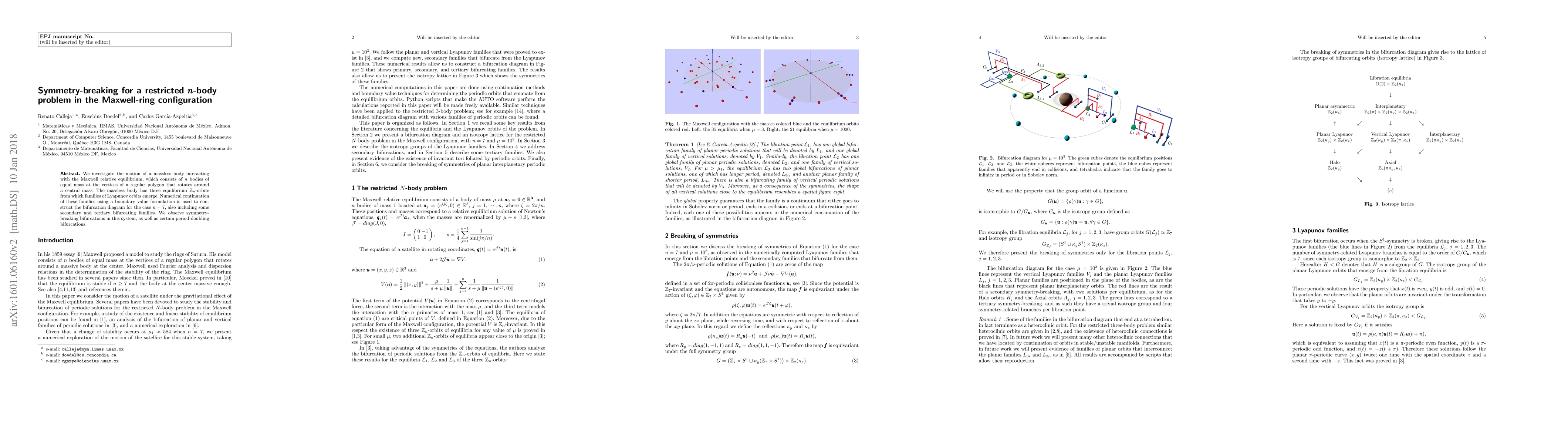 This paper studies the motion of a massless body in the Maxwell-ring configuration, where n bodies rotate around a central mass, focusing on symmetry-breaking bifurcations and period-doubling bifurcations. Numerical continuation techniques reveal complex Lyapunov orbits and bifurcations, particularly for n=7.