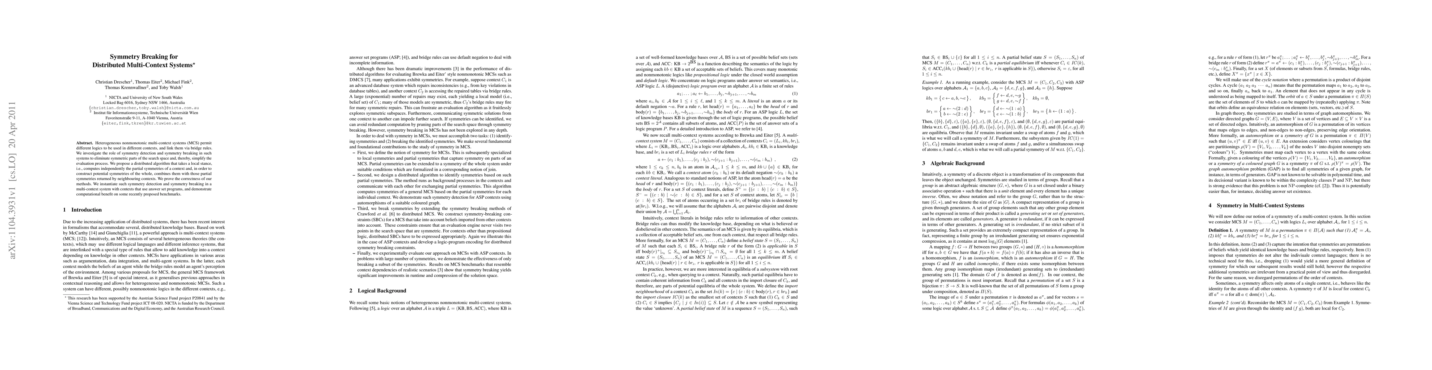 This paper explores symmetry detection and breaking in distributed multi-context systems to simplify evaluation. It proposes a distributed algorithm that computes local symmetries and combines them to identify global symmetries, thereby reducing the search space. The method is instantiated and shown to provide computational benefits on benchmarks.