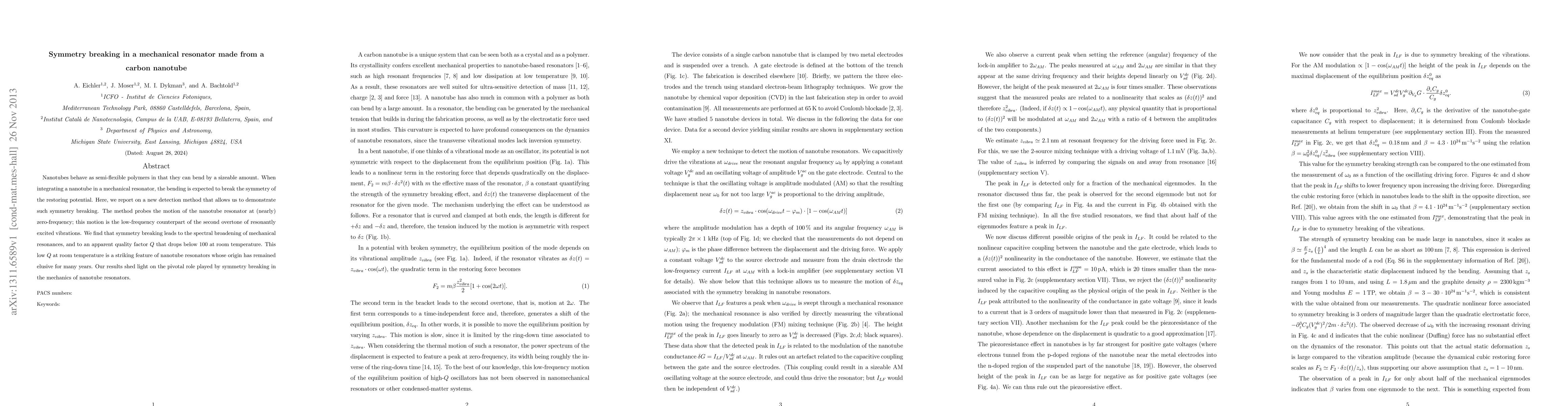 Nanotubes behave as semi-flexible polymers in that they can bend by a sizeable amount. When integrating a nanotube in a mechanical resonator, the bending is expected to break the symmetry of the restoring potential. Here we report on a new detection method that allows us to demonstrate such symmetry breaking. The method probes the motion of the nanotube resonator at nearly zero-frequency; this motion is the low-frequency counterpart of the second overtone of resonantly excited vibrations. We find that symmetry breaking leads to the spectral broadening of mechanical resonances, and to an apparent quality factor that drops below 100 at room temperature. The low quality factor at room temperature is a striking feature of nanotube resonators whose origin has remained elusive for many years. Our results shed light on the role played by symmetry breaking in the mechanics of nanotube resonators.
