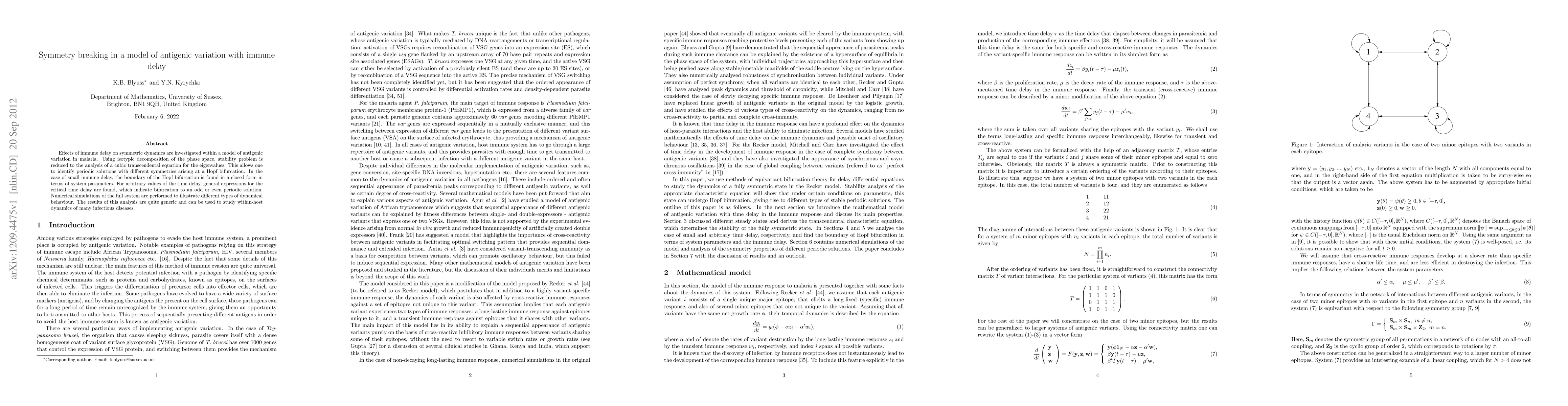 Effects of immune delay on symmetric dynamics are investigated within a model of antigenic variation in malaria. Using isotypic decomposition of the phase space, stability problem is reduced to the analysis of a cubic transcendental equation for the eigenvalues. This allows one to identify periodic solutions with different symmetries arising at a Hopf bifurcation. In the case of small immune delay, the boundary of the Hopf bifurcation is found in a closed form in terms of system parameters. For arbitrary values of the time delay, general expressions for the critical time delay are found, which indicate bifurcation to an odd or even periodic solution. Numerical simulations of the full system are performed to illustrate different types of dynamical behaviour. The results of this analysis are quite generic and can be used to study within-host dynamics of many infectious diseases.