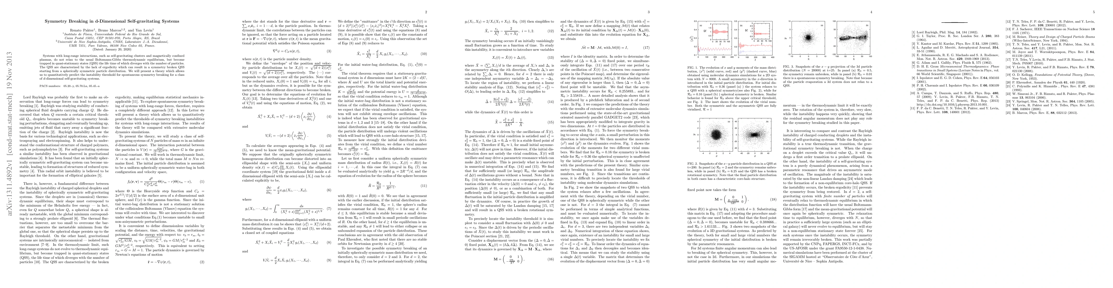 Systems with long-range interactions, such as self-gravitating clusters and magnetically confined plasmas, do not relax to the usual Boltzmann-Gibbs thermodynamic equilibrium, but become trapped in quasi-stationary states (QSS) the life time of which diverges with the number of particles. The QSS are characterized by the lack of ergodicity which can result in a symmetry broken QSS starting from a spherically symmetric particle distribution. We will present a theory which allows us to quantitatively predict the instability threshold for spontaneous symmetry breaking for a class of d-dimensional self-gravitating systems.