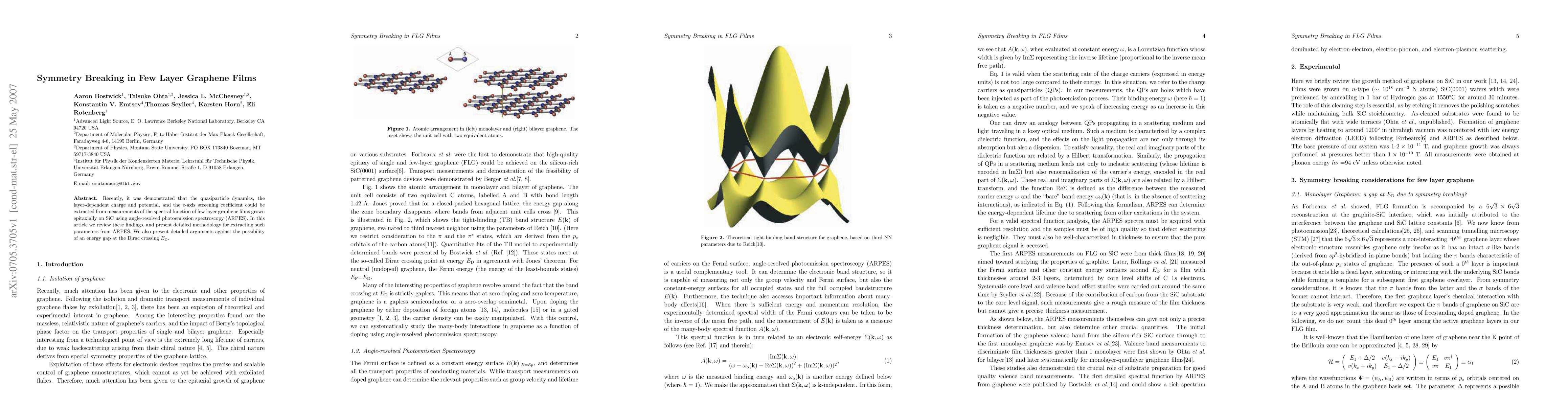 Recently, it was demonstrated that the quasiparticle dynamics, the layer-dependent charge and potential, and the c-axis screening coefficient could be extracted from measurements of the spectral function of few layer graphene films grown epitaxially on SiC using angle-resolved photoemission spectroscopy (ARPES). In this article we review these findings, and present detailed methodology for extracting such parameters from ARPES. We also present detailed arguments against the possibility of an energy gap at the Dirac crossing ED.
