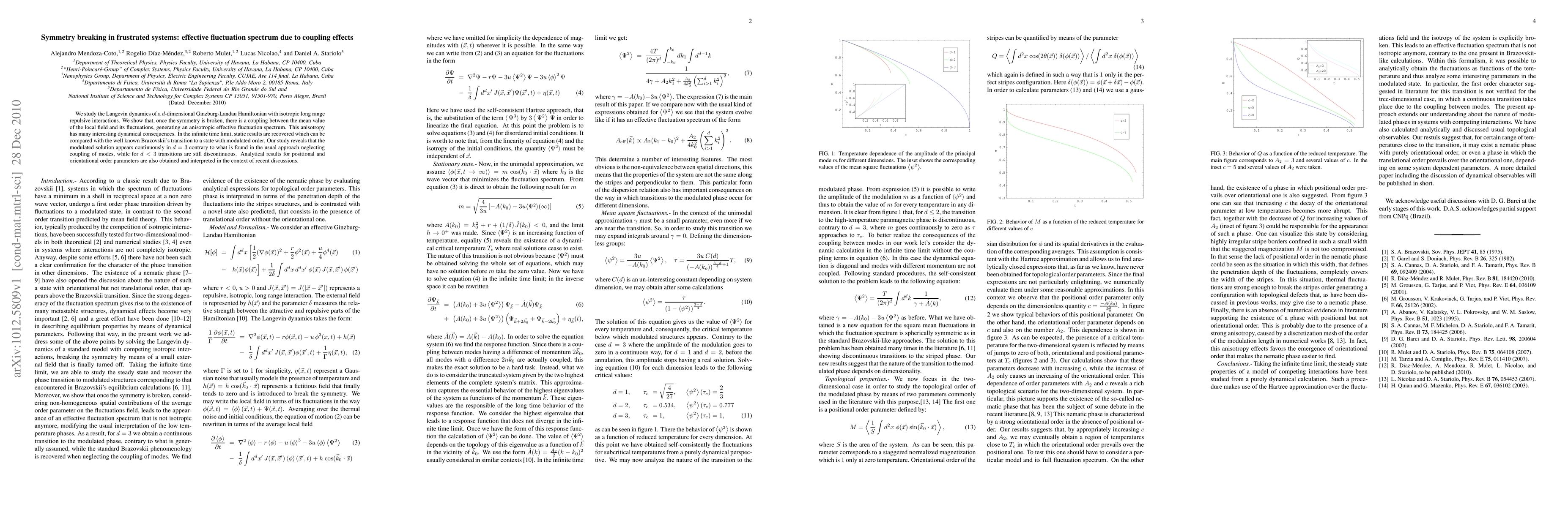We study the Langevin dynamics of a d-dimensional Ginzburg-Landau Hamiltonian with isotropic long range repulsive interactions. We show that, once the symmetry is broken, there is a coupling between the mean value of the local field and its fluctuations, generating an anisotropic effective fluctuation spectrum. This anisotropy has many interesting dynamical consequences. In the infinite time limit, static results are recovered which can be compared with the well known Brazovskii's transition to a state with modulated order. Our study reveals that the modulated solution appears continuously in d = 3 contrary to what is found in the usual approach neglecting coupling of modes, while for d < 3 transitions are still discontinuous. Analytical results for positional and orientational order parameters are also obtained and interpreted in the context of recent discussions.