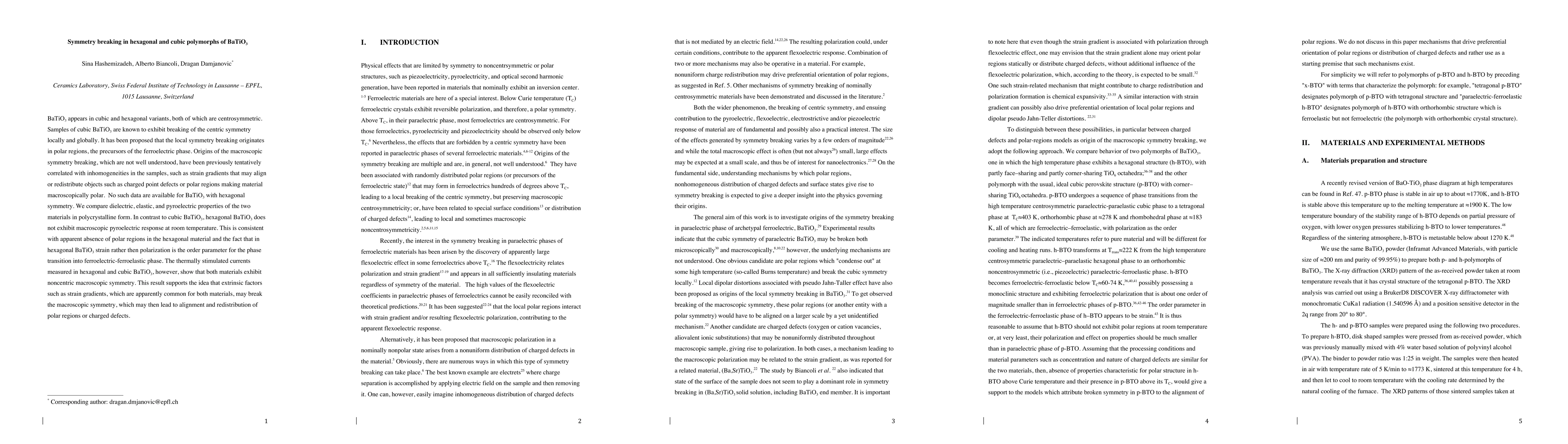Researchers compare properties of cubic and hexagonal BaTiO3 polymorphs, finding that hexagonal BaTiO3 lacks macroscopic pyroelectric response at room temperature, while both exhibit noncentric symmetry breaking due to strain gradients.
