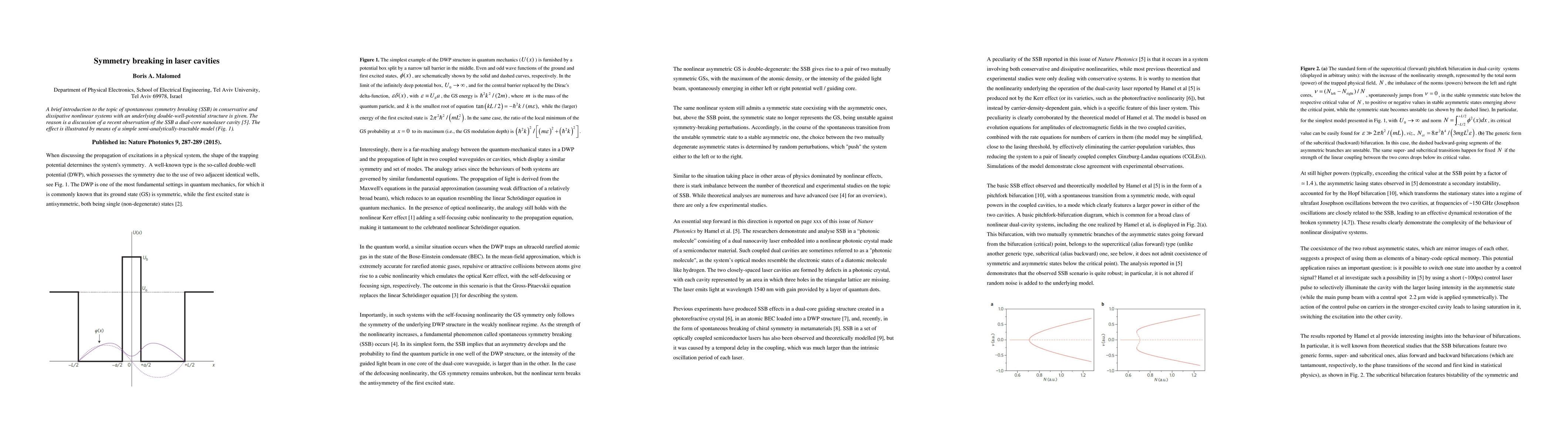 A brief introduction to the topic of spontaneous symmetry breaking (SSB) in conservative and dissipative nonlinear systems with an underlying double-well-potential structure is given. The reason is a discussion of a recent observation of the SSB a dual-core nanolaser cavity [5]. The effect is illustrated by means of a simple semi-analytically-tractable model (Fig. 1).