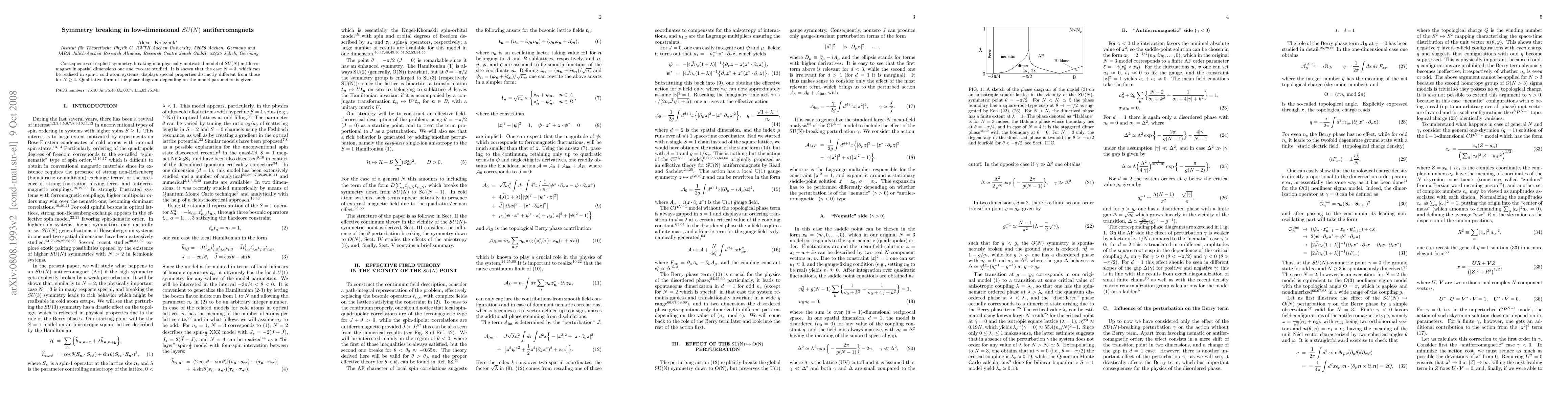 Consequences of explicit symmetry breaking in a physically motivated model of SU(N) antiferromagnet in spatial dimensions one and two are studied. It is shown that the case N=3, which can be realized in spin-1 cold atom systems, displays special properties distinctly different from those for N>=4. Qualitative form of the phase diagram depending on the model parameters is given.
